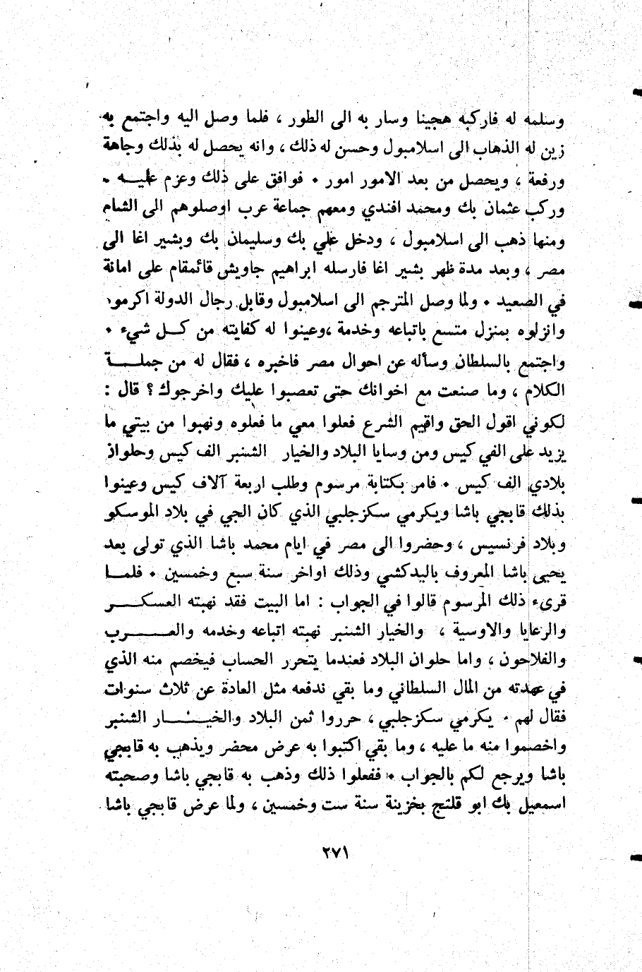 وسلمه له فاركبه هجينا وسار به إلى الطور فلما وصل إليه واجتمع به زين له الذهاب إلى اسلامبول وحسن له ذلك وانه يحصل له بذلك وجاهة ورفعة ويحصل من بعد الأمور أمور. فوافق على ذلك وعزم عليه وركب عثمان بك ومحمد افندي ومعهم جماعة عرب اوصلوهم إلى الشام ومنها ذهب إلى اسلامبول ودخل علي بك وسليمان بك وبشير اغا إلى مصر وبعد مدة ظهر بشير اغا فأرسله إبراهيم جاويش قائمقام على امانة في الصعيد. ولما وصل المترجم إلى اسلامبول وقابل رجال االدولة أكرموه وانزلوه بمنزل متسع باتباعه وخدمة وعينوا له كفايته من كل شيء. واجتمع بالسلطان وسأله عن احوال مصر فاخبره فقال له: من جملة الكلام وما صنعت مع اخوانك حتى تعصبوا عليك واخرجوك قال: لكوني أقول الحق واقيم الشرع فعلوا معي ما فعلوه ونهبوا من بيتي ما يزيد على الفي كيس ومن وسايا البلاد والخيار الشنبر ألف كيس وحلوان بلادي ألف كيس. فامر بكتابة مرسوم وطلب أربعة آلاف كيس وعينوا بذلك قابجي باشا ويكرمي سكزجلبي الذي كان الجي في بلاد الموسكو وبلاد فرنسيس وحضروا إلى مصر في أيام محمد باشا الذي تولى بعد يحيى باشا المعروف باليدكشي وذلك أواخر سنة سبع وخمسين. فلما قرىء ذلك المرسوم قالوا: في الجواب أما البيت فقد نهبته العسكر والرعايا والأوسية والخيار الشنبر نهبته اتباعه وخدمه والعرب والفلاحون وأما حلوان البلاد فعندما يتحرر الحساب فيخصم منه الذي في عهدته من المال السلطاني وما بقي ندفعه مثل العادة عن ثلاث سنوات فقال لهم: يكرمي سكزجلبي حرروا ثمن البلاد والخيار الشنبر واخصموا منه ما عليه وما بقي أكتبوا به عرض محضر ويذهب به قابجي باشا ويرجع لكم بالجواب. ففعلوا ذلك وذهب قابجي باشا وصحبته إسمعيل بك أبو قلتج بخزينة سنة ست وخمسين ولما عرض قابجي باشا
