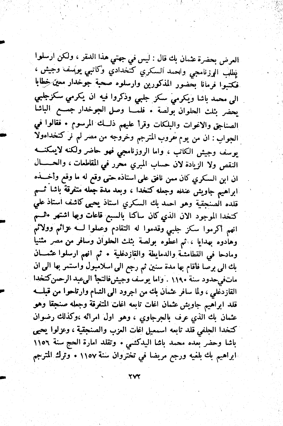 العرض بحضرة عثمان بك قال: ليس في جهتي هذا القدر ولكن أرسلوا يطلب الرزنامجي وأحمد السكري كتخدادي وكاتبي يوسف وجيش فكتبوا فرمانا بحضور المذكورين وأرسلوه صحبة جوخدار معين خطابا إلى محمد باشا ويكرمي سكن جلبي وذكروا فيه أن يكرمي سكزجلبي يحضر بثلث الحلوان بولصة. فلما وصل الجوخدار جمع الباشا الصناجق والاغوات والبلكات وقرأ عليهم ذلك المرسوم. فقالوا في الجواب أن من يوم هروب المترجم وخروجه من مصر لم نر كتخداه ولا يوسف وجيش الكاتب وأما الروزنامجي فهو حاضر ولكنه لا يمكنه النقص ولا الزيادة لأن حساب المبري محرر في المقاطعات والحال أن ابن السكري كان ممن نافق على أستاذه حتى وقع له ما وقع وأخذه إبراهيم جاويش عنده وجعله كتخدا وبعد مدة جعله متفرقة باشا ثم قلده الصنجقية وهو أحمد بك السكري أستاذ يحيى كاشف أستاذ علي كتخدا الموجود الآن الذي كان ساكنا بالسبع قاعات وبها اشتهر. ثم إنهم أكرموا سكز جلبي وقدموا له التقادم وعملوا له عزائم وولائم وهادوه بهدايا ثم اعطوه بولصة بثلث الحلوان وسافر من مصر مثنيا ومادحا في القطامشة والدمايطة والقازدغلية. ثم إنهم أرسلوا عثمان بك إلى برصا فأقام بها مدة سنين ثم رجع إلى اسلامبول واستمر بها إلى أن مات في حدود سنة 1190. واما يوسف وجيش فالتجأ إلى عبد الرحمن كتخدا القازدغلي ولما سافر عثمان بك من اجرود إلى الشام وارتاحوا من قبله قلد إبراهيم جاويش عثمان اغات تابعه المتفرقة وجعله صنجقا وهو عثمان بك الذي عرف بالجرجاوي وهو أول أمرائه وكذلك رضوان كتخدا الجلفي قلد تابعه إسمعيل اغات العزب والصنجقية وعزلوا يحيى باشا وحضر بعده محمد باشا اليدكشي. وتقلد إمارة الحج سنة 1156 إبراهيم بك بلغيه ورجع مريضا في تختروان سنة 1157. وترك المترجم