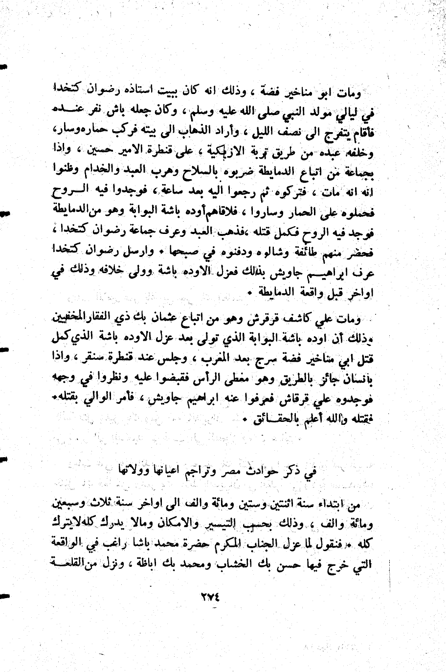 من ابتداء سنة اثنتين وستين ومائة وألف إلى أواخر سنة ثلاث وسبعين ومائة وألف وذلك بحسب التيسير والامكان وما لا يدرك كله لا يترك كله. فنقول لما عزل الجناب المكرم حضرة محمد باشا راغب في الواقعة التي خرج فيها حسن بك الخشاب ومحمد بك اباظة ونزل من القلعة.