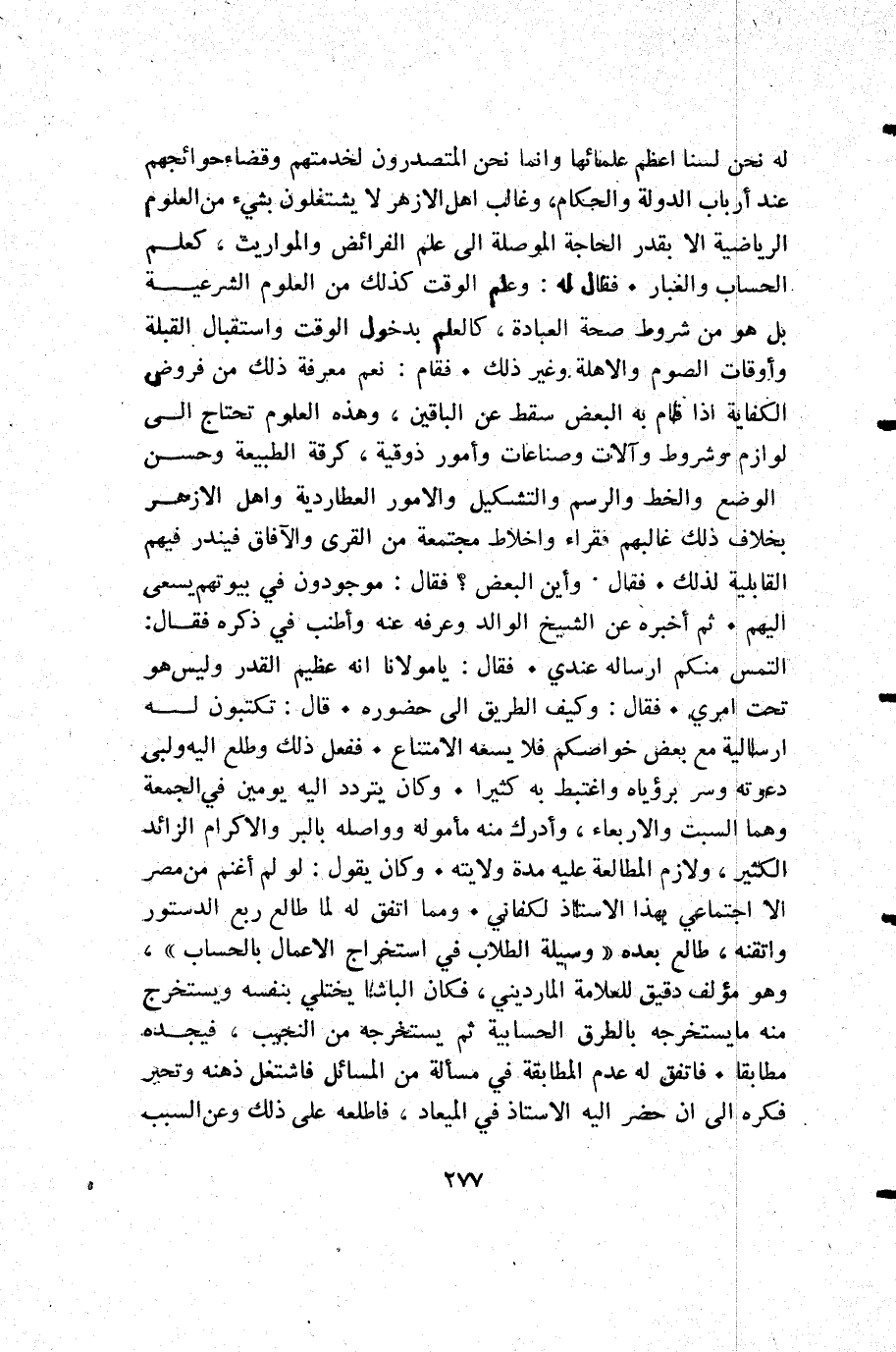 له: نحن لسنا أعظم علمائها وإنما نحن المتصدرون لخدمتهم وقضاء حوائجهم عند أرباب الدولة والحكام وغالب أهل الأزهر لا يشتغلون بشيء من العلوم الرياضية إلا بقدر الحاجة الموصلة إلى علم الفرائض والمواريث كعلم الحساب والغبار. فقال له: وعلم الوقت كذلك من العلوم الشرعية بل هو من شروط صحة العبادة كالعلم بدخول الوقت واستقبال القبلة وأوقات الصوم والأهلة وغير ذلك. فقال: نعم معرفة ذلك من فروض الكفاية إذا قام به البعض سقط عن الباقين وهذه العلوم تحتاج إلى لوازم وشروط وآلات وصناعات وأمور ذوقية كرقة الطبيعة وحسن الوضع والخط والرسم والتشكيل والأمور العطاردية وأهل الأزهر بخلاف ذلك غالبهم فقراء واخلاط مجتمعة من القرى والآفاق فيندر فيهم القابلية لذلك. فقال: وأين البعض فقال: موجودون في بيوتهم يسعى إليهم. ثم أخبره عن الشيخ الوالد وعرفه عنه وأطنب في ذكره فقال: التمس منكم ارساله عندي. فقال: يا مولانا أنه عظيم القدر وليس هو تحت امري. فقال: وكيف الطريق إلى حضوره. قال: تكتبون له ارسالية مع بعض خواصكم فلا يسعه الامتناع. ففعل ذلك وطلع إليه ولبى دعوته وسر برؤياه واغتبط به كثيرا. وكان يتردد إليه يومين في الجمعة وهما السبت والاربعاء وأدرك منه مأموله وواصله بالبر والاكرام الزائد الكثير ولازم المطالعة عليه مدة ولايته. وكان يقول: لو لم أغنم من مصر إلا اجتماعي بهذا الأستاذ لكفاني. ومما اتفق له لما طالع ربع الدستور واتقنه طالع بعده وسيلة الطلاب في استخراج الاعمال بالحساب وهو مؤلف دقيق للعلامة المارديني فكان الباشا يختلي بنفسه ويستخرج منه ما يستخرجه بالطرق الحسابية ثم يستخرجه من النجيب فيجده مطابقا. فاتفق له عدم المطابقة في مسألة من المسائل فاشتغل ذهنه وتحير فكره إلى أن حضر إليه الأستاذ في الميعاد فاطلعه على ذلك وعن السبب