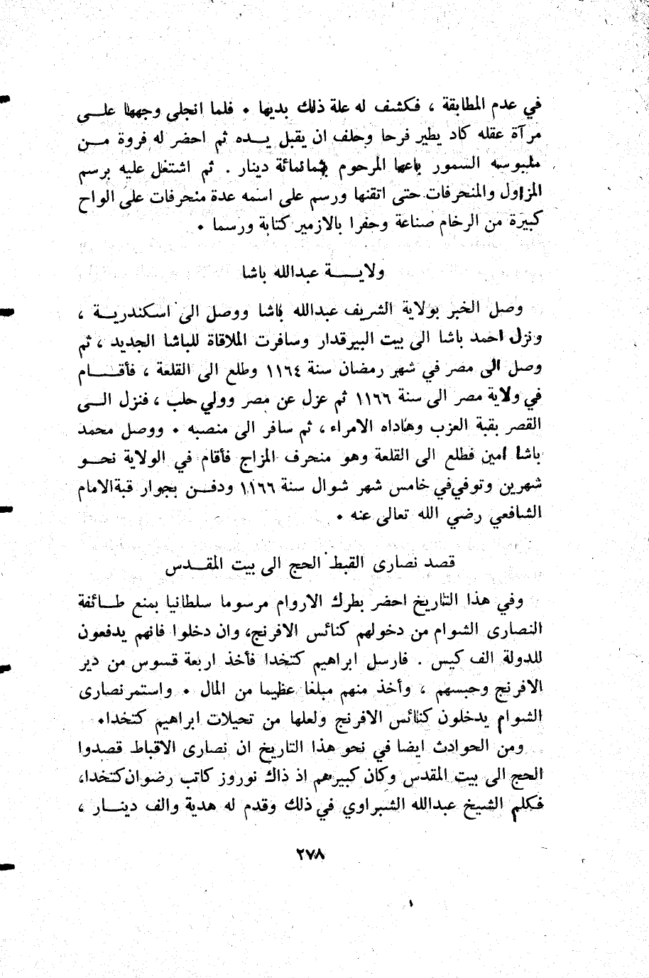 ومن الحوادث أيضا في نحو هذا التاريخ أن نصارى الاقباط قصدوا الحج إلى بيت المقدس وكان كبيرهم إذ ذاك نوروز كاتب رضوان كتخدا فكلم الشيخ عبد الله الشبراوي في ذلك وقدم له هدية وألف دينار.
