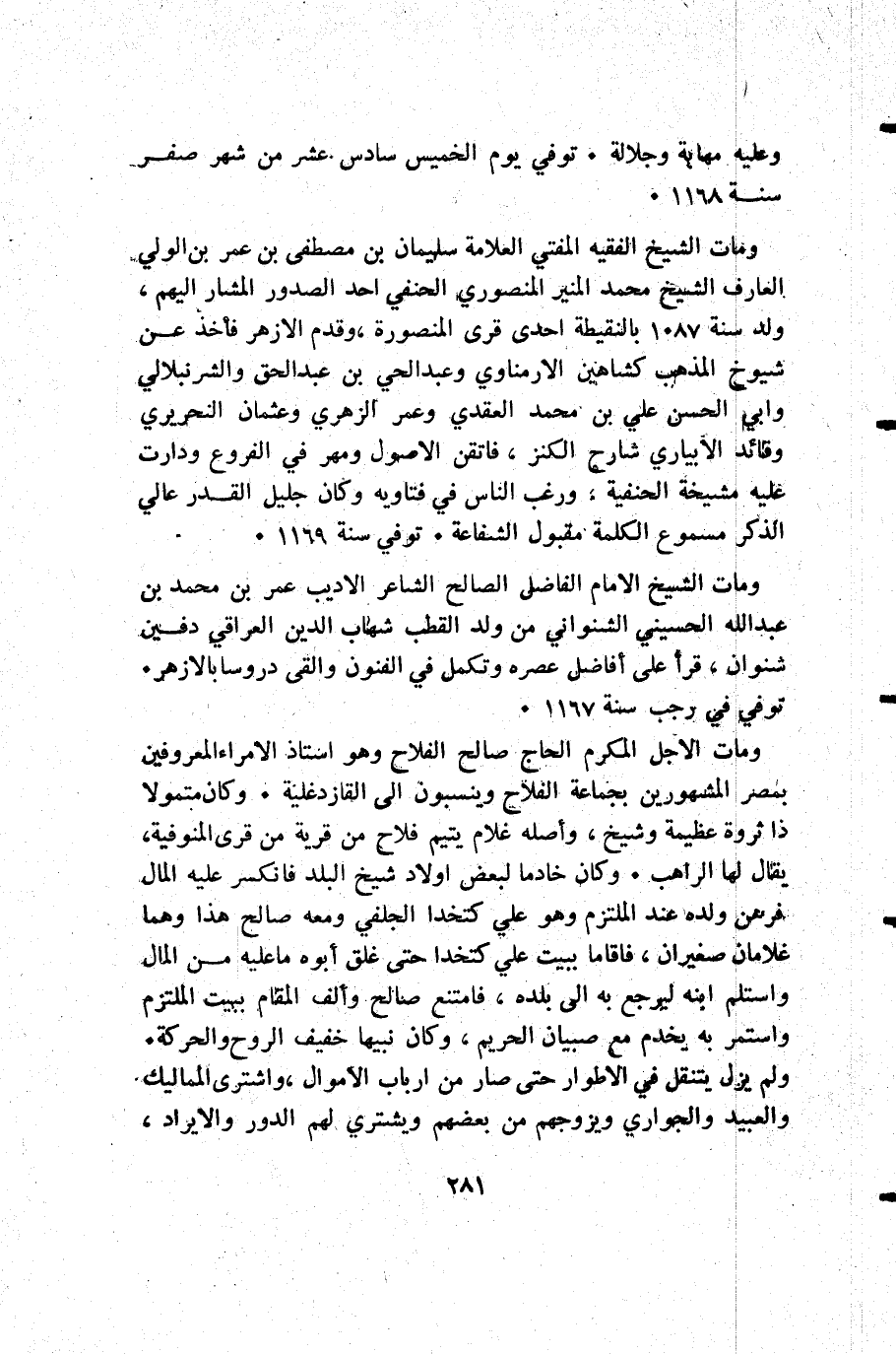 ومات الشيخ الفقيه المفتي العلامة سليمان بن مصطفى بن عمر بن الولي العارف الشيخ محمد المنير المنصوري الحنفي أحد الصدور المشار إليهم ولد سنة 1087 بالنقيطة أحدى قرى المنصورة وقدم الأزهر فأخذ عن شيوخ المذهب كشاهين الارمناوي وعبد الحي بن عبد الحق والشرنبلالي وأبي الحسن علي بن محمد العقدي وعمر الزهري وعثمان النحريري وقائد الابياري شارح الكنز فاتقن الأصول ومهر في الفروع ودارت عليه مشيخة الحنفية ورغب الناس في فتاويه وكان جليل القدر عالي الذكر مسموع الكلمة مقبول الشفاعة. توفي سنة 1169.
