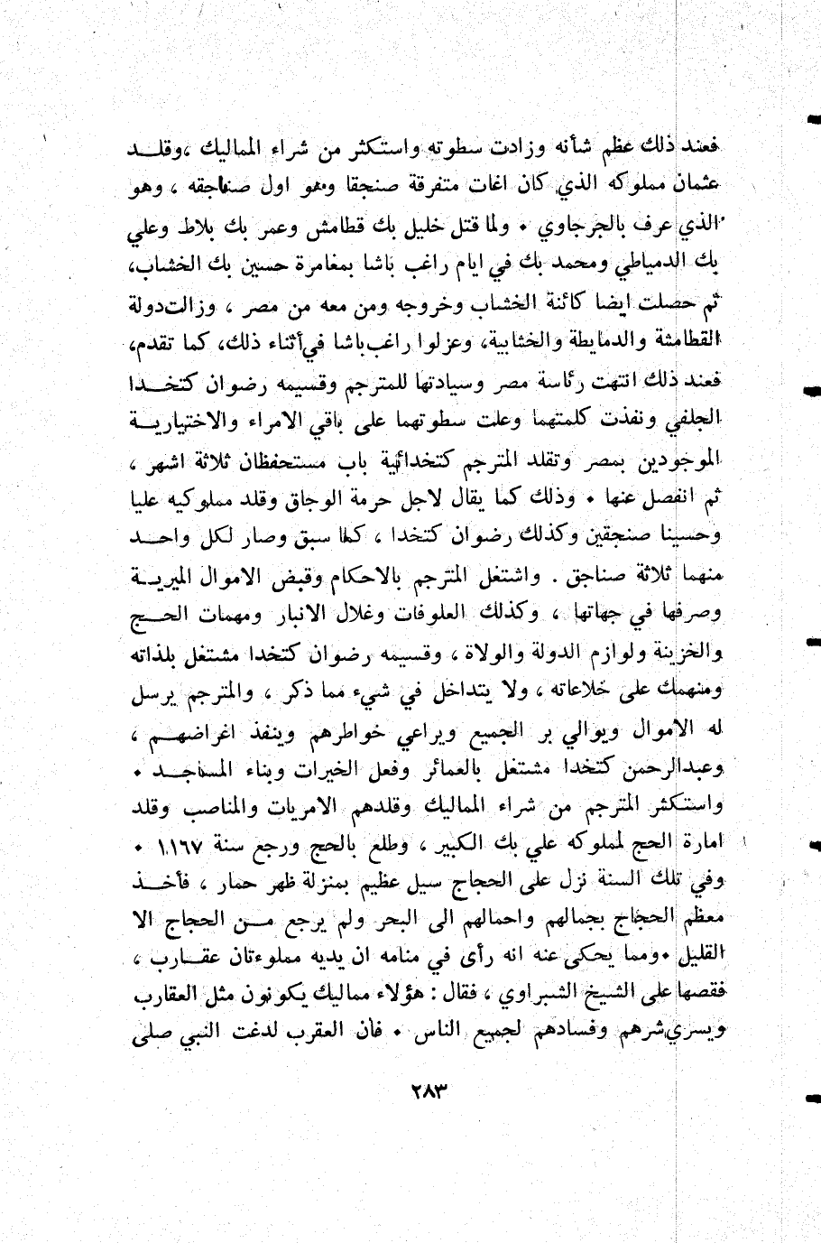 فعند ذلك عظم شأنه وزادت سطوته واستكثر من شراء المماليك وقلد عثمان مملوكه الذي كان اغات متفرقة صنجقا وهو أول صناجقه وهو الذي عرف بالجرجاوي. ولما قتل خليل بك قطامش وعمر بك بلاط وعلي بك الدمياطي ومحمد بك في أيام راغب باشا بمغامرة حسين بك الخشاب ثم حصلت أيضا كائنة الخشاب وخروجه ومن معه من مصر وزالت دولة القطامشة والدمايطة والخشابية وعزلوا راغب باشا في اثناء ذلك كما تقدم فعند ذلك انتهت رئاسة مصر وسيادتها للمترجم وقسيمه رضوان كتخدا الجلفي ونفذت كلمتهما وعلت سطوتهما على باقي الأمراء والاختيارية الموجودين بمصر وتقلد المترجم كتخدائية باب مستحفظان ثلاثة أشهر ثم انفصل عنها. وذلك كما يقال لأجل حرمة الوجاق وقلد مملوكية عليا وحسينا صنجقين وكذلك رضوان كتخدا كما سبق وصار لكل واحد منهما ثلاثة صناجق. واشتعل المترجم بالأحكام وقبض الأموال الميرية وصرفها في جهاتها وكذلك العلوفات وغلال الانبار ومهمات الحج والخزينة ولوازم الدولة والولاة وقسيمة رضوان كتخدا مشتغل بلذاته ومنهمك على خلاعاته ولا يتداخل في شيء مما ذكر والمترجم يرسل له الأموال ويوالي بر الجميع ويراعي خواطرهم وينفذ اغراضهم وعبد الرحمن كتخدا مشتغل بالعمائر وفعل الخيرات وبناء المساجد. واستكثر المترجم من شراء المماليك وقلدهم الأمريات والمناصب وقلد إمارة الحج لمملوكه علي بك الكبير وطلع بالحج ورجع سنة 1167. وفي تلك السنة نزل على الحجاج سيل عظيم بمنزلة ظهر حمار فأخذ معظم الحجاج بجمالهم واحمالهم إلى البحر ولم يرجع من الحجاج إلا القليل. ومما يحكى عنه أنه رأى في منامه أن يديه مملوءتان عقارب فقصها على الشيخ الشبراوي فقال: هؤلاء مماليك يكونون مثل العقارب ويسري شرهم وفسادهم لجميع الناس. فان العقرب لدغت النبي صلى