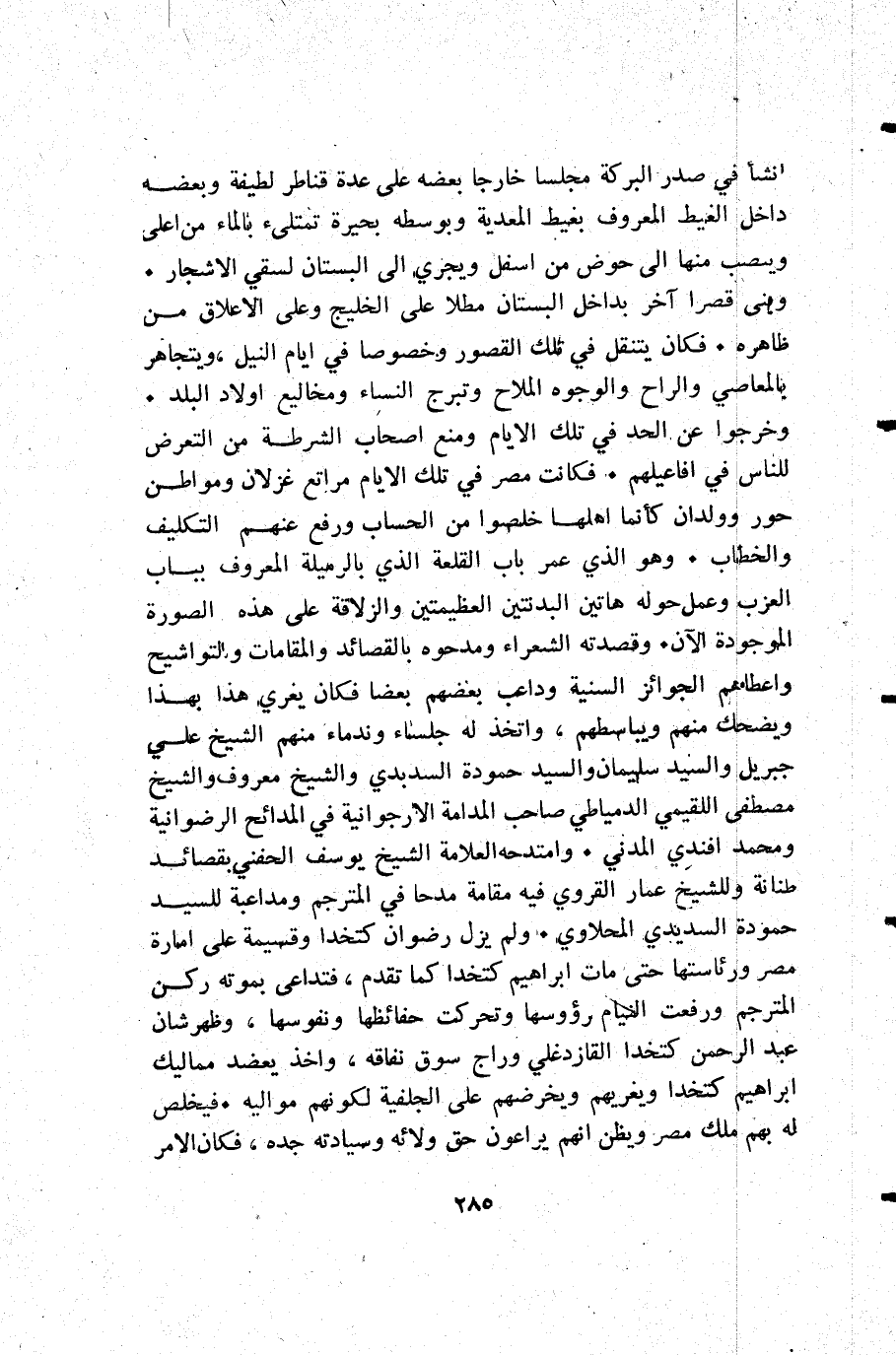 انشأ في صدر البركة مجلسا خارجا بعضه على عدة قناطر لطيفة وبعضه داخل الغيط المعروف بغيط المعدية وبوسطه بحيرة تمتلىء بالماء من اعلى ويصب منها إلى حوض من اسفل ويجري إلى البستان لسقي الأشجار. وبنى قصرا آخر بداخل البستان مطلا على الخليج وعلى الاعلاق من ظاهره. فكان يتنقل في تلك القصور وخصوصا في أيام النيل ويتجاهر بالمعاصي والراح والوجوه الملاح وتبرج النساء ومخاليع أولاد البلد. وخرجوا عن الحد في تلك الأيام ومنع أصحاب الشرطة من التعرض للناس في أفاعيلهم. فكانت مصر في تلك الأيام مراتع غزلان ومواطن حور وولدان كأنما أهلها خلصوا من الحساب ورفع عنهم التكليف والخطاب. وهو الذي عمر باب القلعة الذي بالرميلة المعروف بباب العزب وعمل حوله هاتين البدنتين العظيمتين والزلاقة على هذه الصورة الموجودة الآن. وقصدته الشعراء ومدحوه بالقصائد والمقامات والتواشيح واعطاهم الجوائز السنية وداعب بعضهم بعضا فكان يغري هذا بهذا ويضحك منهم ويباسطهم واتخذ له جلساء وندماء منهم الشيخ علي جبريل والسيد سليمان والسيد حمودة السديدي والشيخ معروف والشيخ مصطفى اللقيمي الدمياطي صاحب المدامة الارجوانية في المدائح الرضوانية ومحمد افندي المدني. وامتدحه العلامة الشيخ يوسف الحفني بقصائد طنانة وللشيخ عمار القروي فيه مدحا في المترجم ومداعبة للسيد حمودة السديدي المحلاوي. ولم يزل رضوان كتخدا وقسيمة على إمارة مصر ورئاستها حتى مات إبراهيم كتخدا كما تقدم فتداعى بموته ركن المترجم ورفعت النيام رؤوسها وتحركت حفائظها ونفوسها وظهر شان عبد الرحمن كتخدا القازدغلي وراج سوق نفاقه وأخذ يعضد مماليك إبراهيم كتخدا ويغريهم ويحرضهم على الجلفية لكونهم مواليه. فيخلص له بهم ملك مصر ويظن أنهم يراعون حق ولائه وسيادته جده فكان الأمر