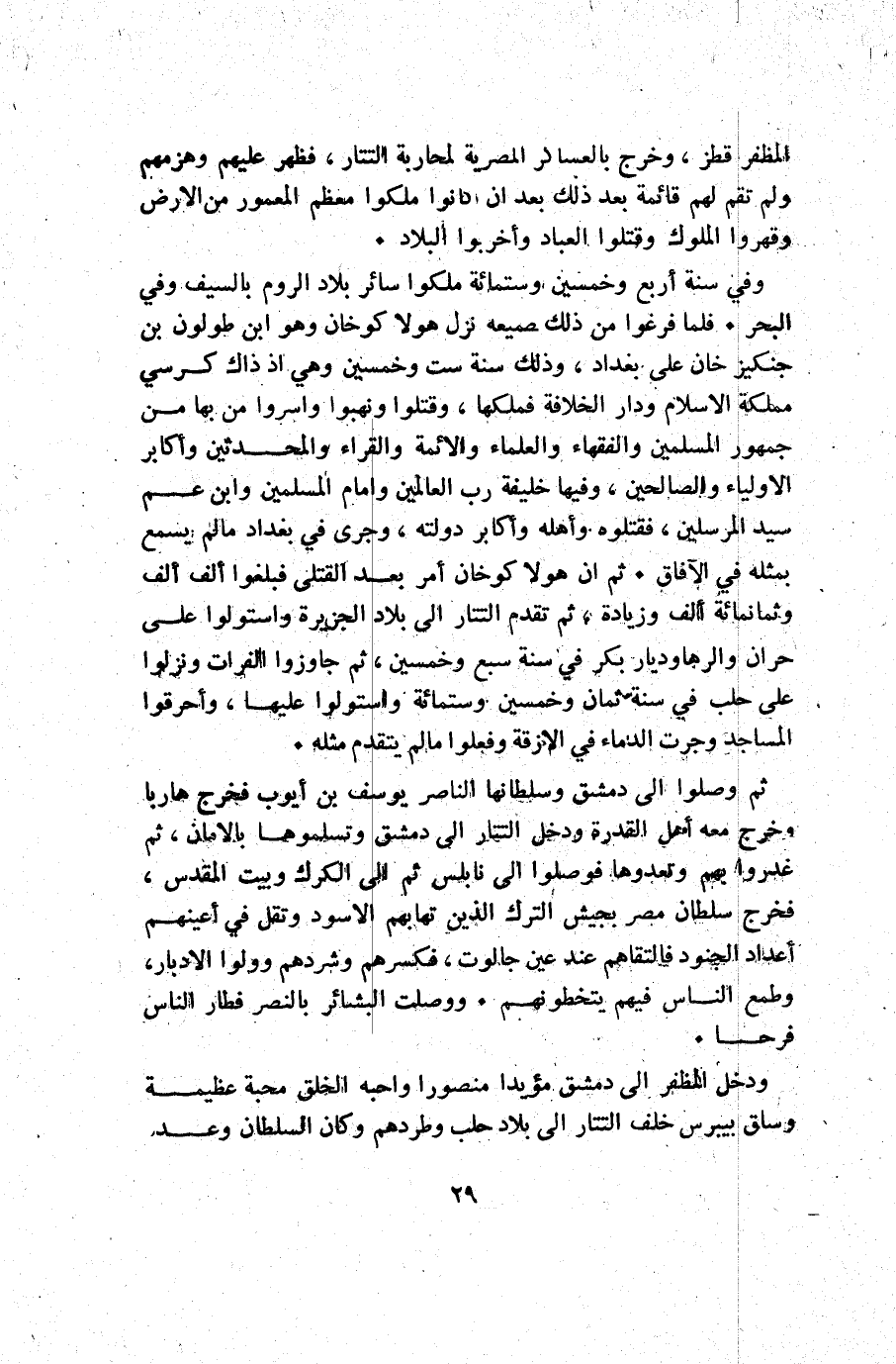 المظفر قطز وخرج بالعساكر المصرية لمحاربة التتار فظهر عليهم وهزمهم ولم تقم لهم قائمة بعد ذلك بعد أن كانوا ملكوا معظم المعمور من الأرض وقهروا الملوك وقتلوا العباد وأخربوا البلاد.
