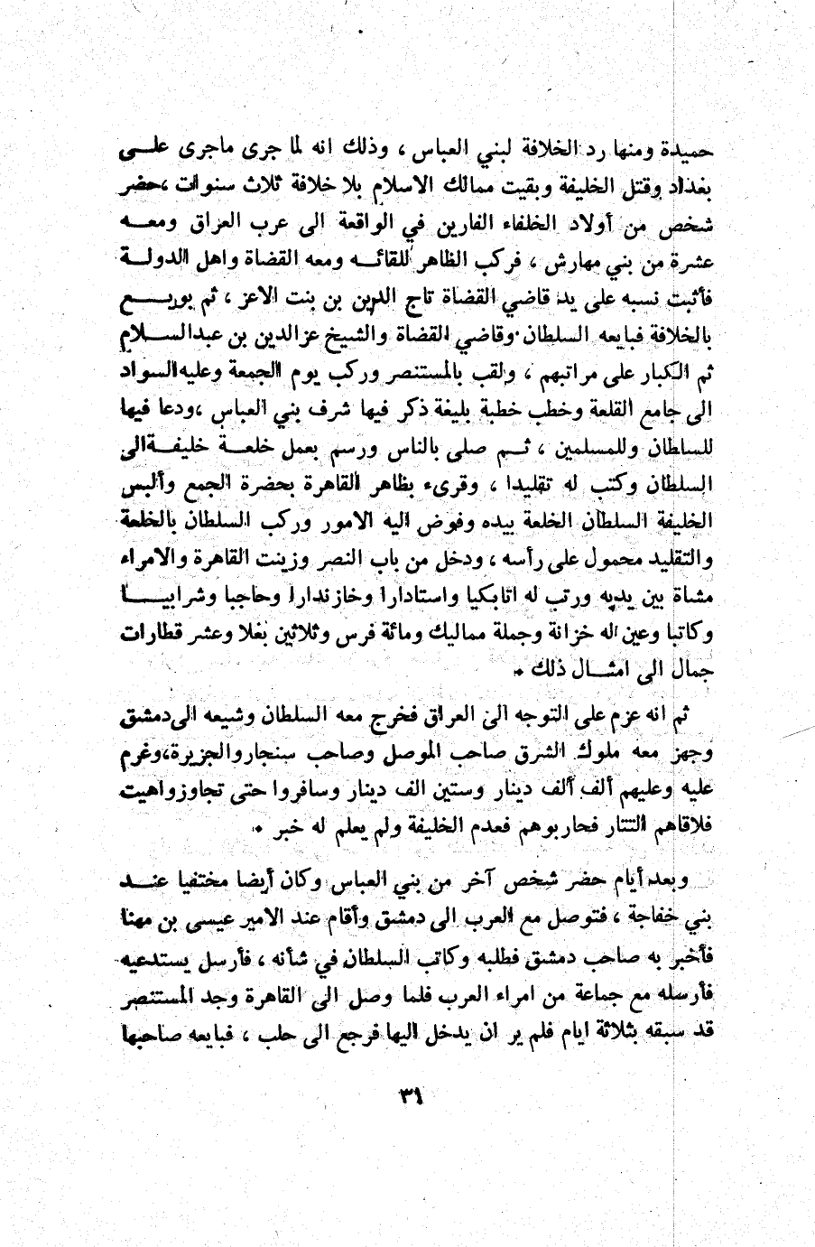 حميدة ومنها رد الخلافة لبني العباس وذلك أنه لما جرى ما جرى على بغداد وقتل الخليفة وبقيت ممالك الإسلام بلا خلافة ثلاث سنوات حضر شخص من أولاد الخلفاء الفارين في الواقعة إلى عرب العراق ومعه عشرة من بني مهارش فركب الظاهر للقائه ومعه القضاة وأهل الدولة فأثبت نسبه على يد قاضي القضاة تاج الدين بن بنت الأعز ثم بويع بالخلافة فبايعه السلطان وقاضي القضاة والشيخ عز الدين بن عبد السلام ثم الكبار على مراتبهم ولقب بالمستنصر وركب يوم الجمعة وعليه السواد إلى جامع القلعة وخطب خطبة بليغة ذكر فيها شرف بني العباس ودعا فيها للسلطان وللمسلمين ثم صلى بالناس ورسم بعمل خلعه خليفة إلى السلطان وكتب له تقليدا وقرىء بظاهر القاهرة بحضرة الجمع وألبس الخليفة السلطان الخلعة بيده وفوض إليه الأمور وركب السلطان بالخلعة والتقليد محمول على رأسه ودخل من باب النصر وزينت القاهرة والأمراء مشاة بين يديه ورتب له أتابكيا واستادارا وخازندارا وحاجبا وشرابيا وكاتبا وعين له خزانة وجملة مماليك ومائة فرس وثلاثين بغلا وعشر قطارات جمال إلى امثال ذلك.