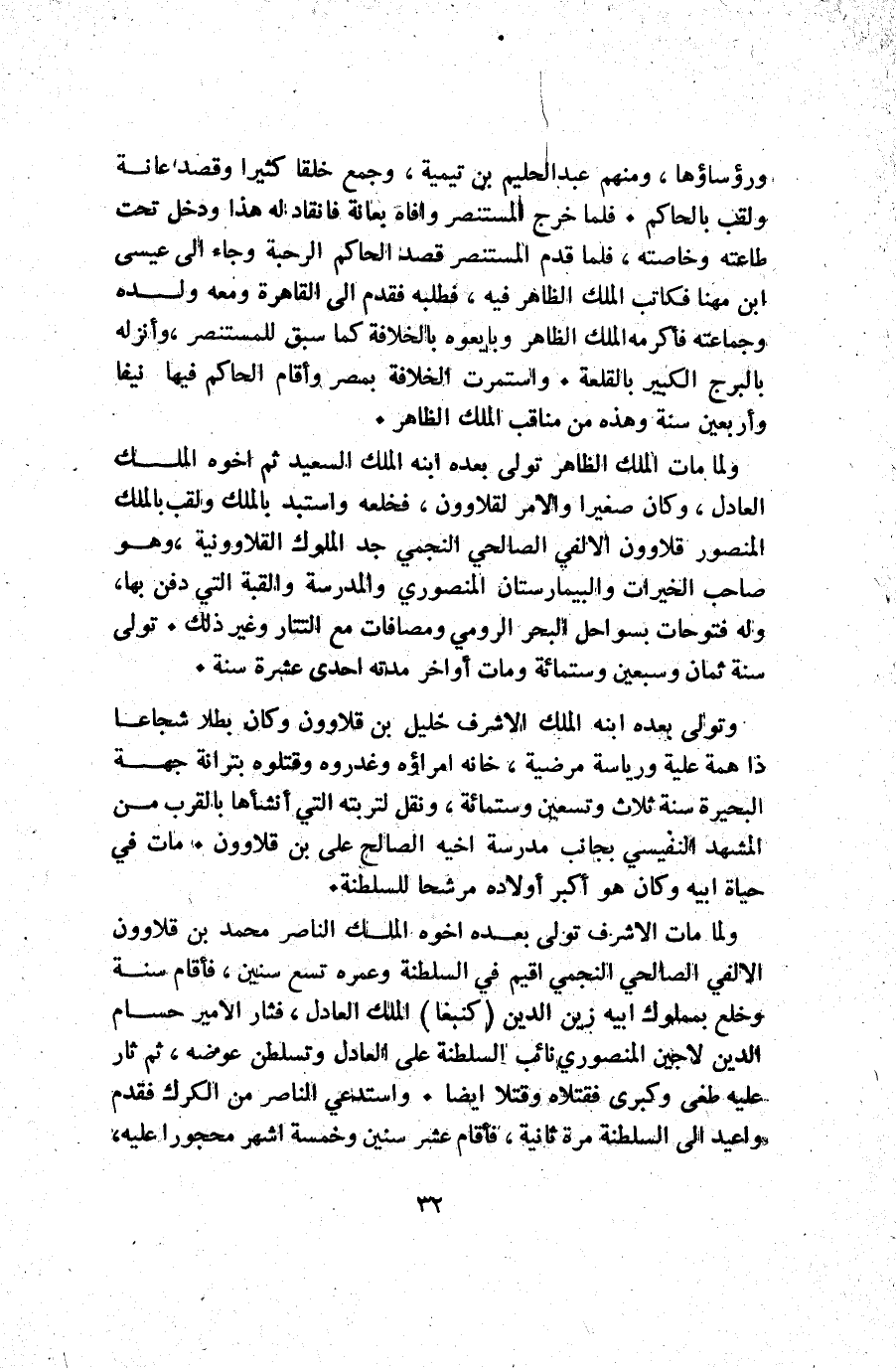 ولما مات الملك الظاهر تولى بعده ابنه الملك السعيد ثم أخوه الملك العادل وكان صغيرا والأمر لقلاوون فخلعه واستبد بالملك ولقب بالملك المنصور قلاوون الالفي الصالحي النجمي جد الملوك القلاوونية وهو صاحب الخيرات والبيمارستان المنصوري والمدرسة والقبة التي دفن بها وله فتوحات بسواحل البحر الرومي ومصافات مع التتار وغير ذلك. تولى سنة ثمان وسبعين وستمائة ومات أواخر مدته أحدى عشرة سنة.