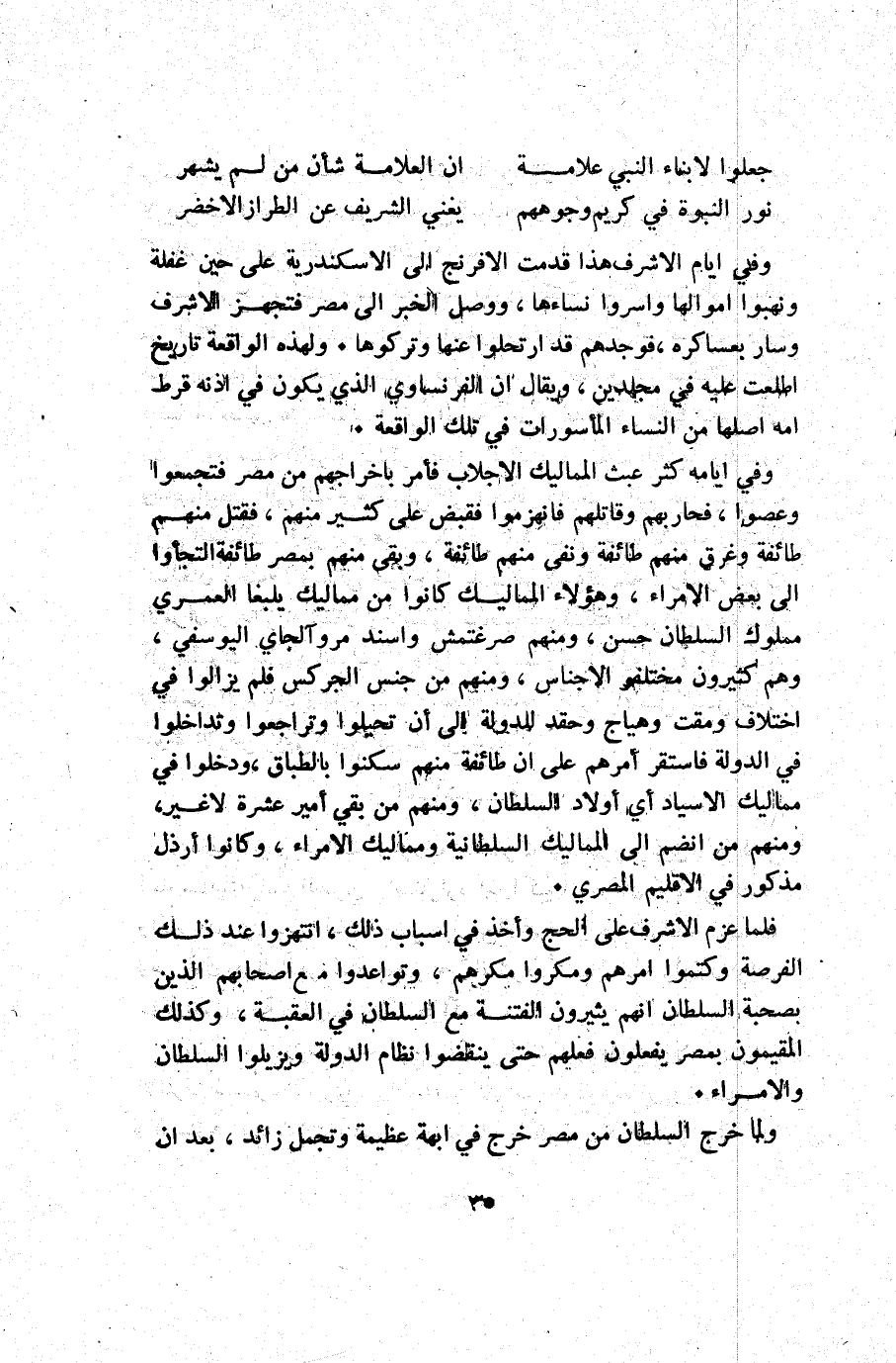وفي أيام الأشراف هذا قدمت الإفرنج إلى الأسكندرية على حين غفلة ونهبوا أموالها واسروا نساءها ووصل الخبر إلى مصر فتجهز الأشرف وسار بعساكره فوجدهم قد ارتحلوا عنها وتركوها. ولهذه الواقعة تاريخ اطلعت عليه في مجلدين ويقال أن الفرنساوي الذين يكون في أذنه قرط امه اصلها من النساء المأسورات في تلك الواقعة.