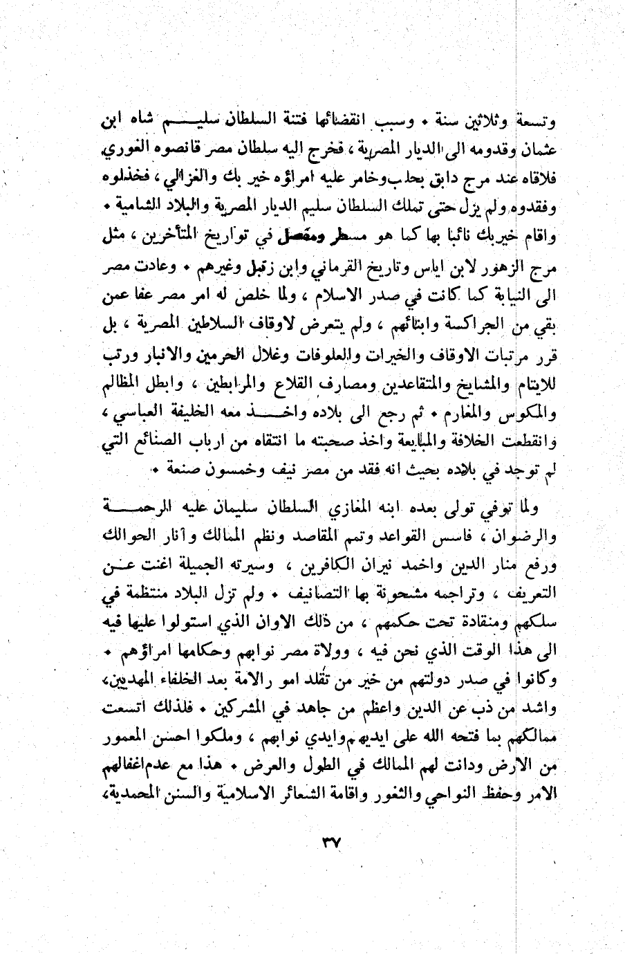 ولما توفي تولى بعده ابنه المغازي السلطان سليمان عليه الرحمة والرضوان فاسس القواعد وتمم المقاصد ونظم الممالك وأنار الحوالك ورفع منار الدين واخمد نيران الكافرين وسيرته الجميلة اغنت عن التعريف وتراجمه مشحونة بها التصانيف. ولم تزل البلاد منتظمة في سلكهم ومنقادة تحت حكمهم من ذلك الأوان الذي استولوا عليها فيه إلى هذا الوقت الذي نحن فيه وولاة مصر نوابهم وحكامها أمراؤهم.
