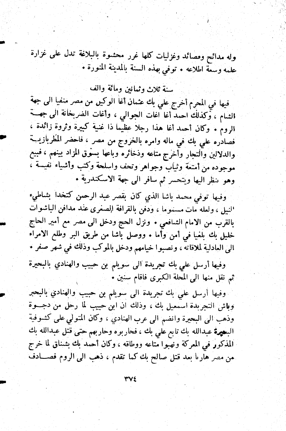 وفيها أرسل علي بك تجريدة إلى سويلم بن حبيب والهنادي بالبحبر وباش التجربدة إسمعيل بك وذلك أن ابن حبيب لما رحل من دجوة وذهب إلى البحيرة وانضم إلى عرب الهنادي وكان المتولي على كشوفية البحيرة عبد الله بك تابع علي بك فحاربوه وحاربهم حتى قتل عبد الله بك المذكور في المعركة ونهبوا متاعة ووطاقه وكان أحمد بك بشناق لما خرج من مصر هاربا بعد قتل صالح بك كما تقدم ذهب إلى الروم فصادف