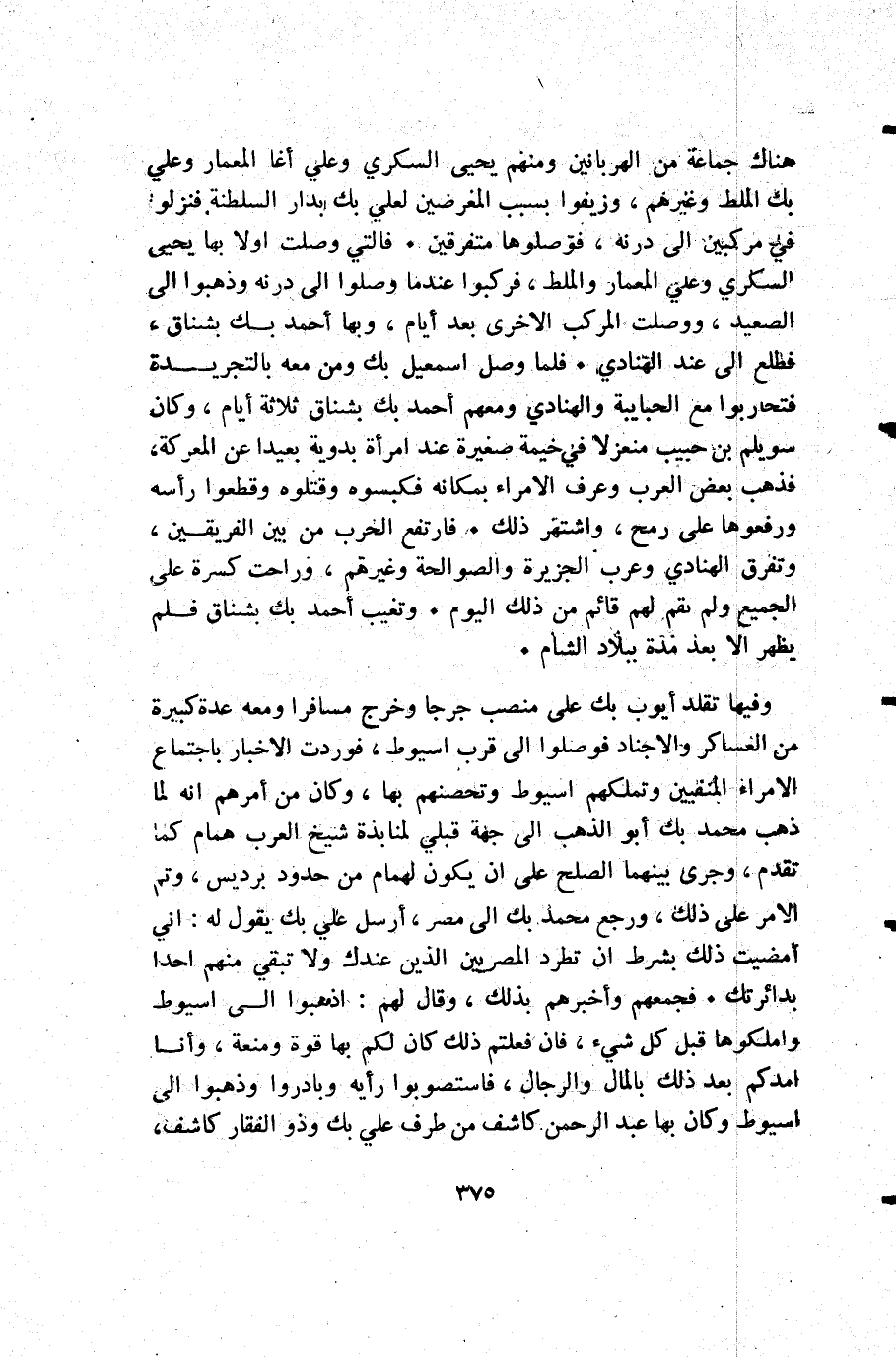 هناك جماعة من الهربانين ومنهم يحيى السكري وعلي أغا المعمار وعلي بك الملط وغيرهم وزيفوا بسبب المغرضين لعلي بك بدار السلطنة فنزلوا في مركبين إلى درنة فوصلوها متفرقين. فالتي وصلت أولا بها يحيى السكري وعلي المعمار والملط فركبوا عندما وصلوا إلى درنة وذهبوا إلى الصعيد ووصلت المركب الأخرى بعد أيام وبها أحمد بك بشناق فطلع إلى عند الهنادي. فلما وصل إسمعيل بك ومن معة بالتجريدة فتحاربوا مع الحبايبة والهنادي ومعهم أحمد بك بشناق ثلاثة أيام وكان سويلم بن حبيب منعزلا في خيمة صغيرة عند امرأة بدوية بعيدا عن المعركة فذهب بعض العرب وعرف الأمراء بمكانة فكبسوه وقتلوه وقطعوا رأسة ورفعوها على رمح واشتهر ذلك. فارتفع الحرب من بين الفريقين وتفرق الهنادي وعرب الجزيرة والصوالحة وغيرهم وراحت كسرة على الجميع ولم يقم لهم قائم من ذلك اليوم. وتغيب أحمد بك بشناق فلم يظهر إلا بعد مدة ببلاد الشام.