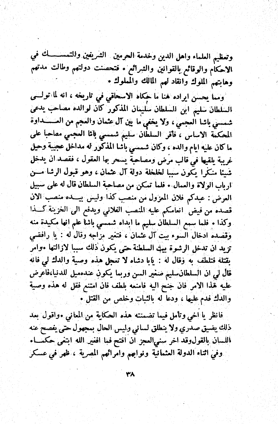 ومما يحسن ايراده هنا ما حكاه الأسحاقي في تاريخه أنه لما تولى السلطان سليم ابن السلطان سليمان المذكور كان لوالده مصاحب يدعى شمسي باشا العجمي ولا يخفي ما بين آل عثمان والعجم من العداوة المحكمة الأساس فأقر السلطان سليم شمسي باشا العجمي مصاحبا على ما كان عليه أيام والده وكان شمسي باشا المذكور له مداخل عجيبة وحيل غريبة يلقيها في قالب مرض ومصاحبة يسحر بها العقول فقصد أن يدخل شيئا منكرا يكون سببا لخلخلة دولة آل عثمان وهو قبول الرشا من أرباب الولاة والعمال. فلما تمكن من مصاحبة السلطان قال له: على سبيل العرض عبدكم فلان المعزول من منصب كذا وليس بيده منصب الآن قصده من فيض انعامكم عليه المنصب الفلاني ويدفع إلى الخزينة كذا وكذا. فلما سمع السلطان سليم ما ابداه شمسي باشا علم أنها مكيدة منه وقصده ادخال السوء بيت آل عثمان فتغير مزاجه وقال له: يا رافضي مريد أن تدخل الرشوة بيت السلطنة حتى يكون ذلك سببا لإزالتها. وامر بقتله فتلطف به وقال له: يابا دشاه لا تعجل هذه وصية والدك لي فإنه قال لي: إن السلطان سليم صغير السن وربما يكون عنده ميل للدنيا فاعرض عليه هذا الأمر فإن جنح إليه فامنعه بلطف فإن امتنع فقل له هذه وصية والدك فدم عليها ودعا له بالثبات وخلص من القتل.