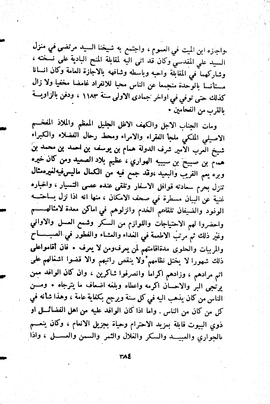 ومات الجناب الأجل والكهف الأظل الجليل المعظم والملاذ المفخم الأصيلي الملكي ملجأ الفقراء والأمراء ومحط رجال الفضلاء والكبراء شيخ العرب الأمير شرف الدولة همام بن يوسف بن أحمد بن محمد بن همام بن صبيح بن سيبيه الهوراي عظيم بلاد الصعيد ومن كان خيره وبره يعم القريب والبعيد وقد جمع فيه من الكمال ما ليس فيه لغيره مثال تنزل بحرم سعادته قوافل الأسفار وتلقى عنده عصى التسيار واخباره غنية عن البيان مسطرة في صحف الامكان منها أنه إذا نزل بساحته الوفود والضيفان تلقاهم الخدم وانزلوهم في اماكن معدة لامثالهم واحضروا لهم الاحتياجات واللوازم من السكر وشمع العسل والأواني وغير ذلك ثم مرتب الاطعمة في الغداء والعشاء والفطور في الصباح والمربيات والحلوى مدة اقامتهم لمن يعرف ومن لا يعرف. فان أقاموا على ذلك شهورا لا يختل نظامهم ولا ينقص راتبهم وإلا قضوا اشغالهم على أتم مرادهم وزادهم أكراما وانصرفوا شاكرين وإن كان الوافد ممن يرتجى البر والاحسان أكرمه واعطاه وبلغه اضعاف ما يترجاه. ومن الناس من كان يذهب إليه في كل سنة ويرجع بكفاية عامة وهذا شأنه في كل من كان من الناس. وأما إذا كان الوافد عليه من أهل الفضائل أو ذوي البيوت قابلة بمزيد الاحترام وحياة بجزيل الأنعام وكان ينعم بالجواري والعبيد والسكر والغلال والثمر والسمن والعسل وإذا