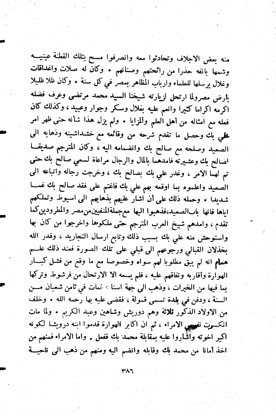 منه بعض الاجلاف وتحادثوا معه وانصرفوا مسح بتلك القطنة عينيه وشمها بانفه حذرا من رائحتهم وصنانهم. وكان له صلات واغداقات وغلال يرسلها للعلماء وأرباب المظاهر بمصر في كل سنة. وكان ظلا ظليلا بارض مصر ولما ارتحل لزيارته شيخنا السيد محمد مرتضى وعرف فضله أكرمه أكراما كثيرا وانعم عليه بغلال وسكر وجوار وعبيد وكذلك كان فعله مع أمثاله من أهل العلم والمزايا. ولم يزل هذا شأنه حتى ظهر أمر علي بك وحصل ما تقدم شرحه من وقائعه من خشداشينه وذهابه إلى الصعيد وصلحه مع صالح بك وانضمامه إليه وكان المترجم صديقا لصالح بك وعشيرته فامدهما بالمال والرجال مراعاة لسعي صالح بك حتى تم لهما الأمر وغدر علي بك بصالح بك وخرجت رجاله واتباعه إلى الصعيد واعلموه بما اوقعه بهم علي بك فاغتم على فقد صالح بك غما شديدا. وحمله ذلك على أن أشار عليهم بذهابهم إلى اسيوط وتملكهم اياها فإنها باب الصعيد فذهبوا إليها مع جملة المنفيين من مصر والمطرودين كما تقدم وامدهم شيخ العرب المترجم حتى ملكوها واخرجوا من كان بها واستوحش منه علي بك بسبب ذلك وتابع ارسال التجاريد وقدر الله بخذلان القبالي ورجوعهم إلى قبلي على تلك الصورة فعند ذلك علم همام أنه لم يبق مطلوبا لهم سواه وخصوصا مع ما وقع من فشل كبار الهوارة وأقاربه ونفاقهم عليه فلم يسعه إلا الارتحال من فرشوط وتركها بما فيها من الخيرات وذهب إلى جهة اسنا فمات في ثامن شعبان من السنة ودفن في بلدة تسمى قمولة فقضى عليه بها رحمه الله. وخلف من الأولاد الذكور ثلاثة وهم درويش وشاهين وعبد الكريم. ولما مات انكسرت نفوس الأمراء ثم أن أكابر الهوارة قدموا ابنه درويشا لكونه أكبر اخوته وأشاروا عليه بمقابلة محمد بك ففعل. وأما الأمراء فنهم من أخذ أمانا من محمد بك وقابله وانضم إليه ومنهم من ذهب إلى ناحية
