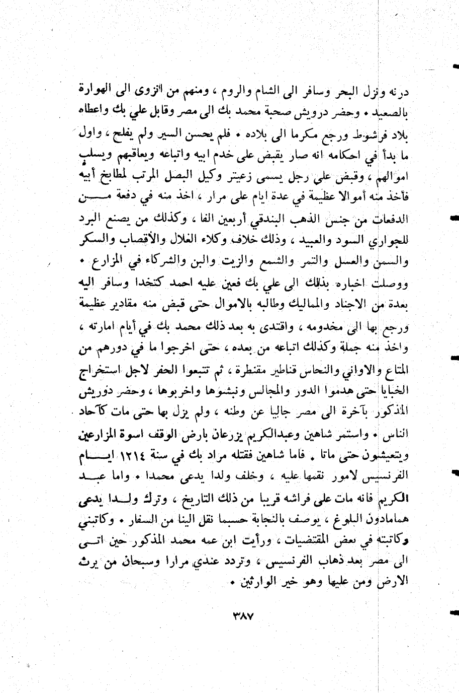 درنه ونزل البحر وسافر إلى الشام والروم ومنهم من انزوى إلى الهوارة بالصعيد. وحضر درويش صحبة محمد بك إلى مصر وقابل علي بك واعطاه بلاد فرشوط ورجع مكرما إلى بلاده. فلم يحسن السير ولم يفلح وأول ما بدأ في احكامه أنه صار يقبض على خدم أبيه واتباعه ويعاقبهم ويسلب أموالهم وقبض على رجل يسمى زعيتر وكيل البصل المرتب لمطابخ أبيه فأخذ منه أموالا عظيمة في عدة أيام على مرار أخذ منه في دفعة من الدفعات من جنس الذهب البندقي أربعين الفا وكذلك من يصنع البرد للجواري السود والعبيد وذلك خلاف وكلاء الغلال والاقصاب والسكر والسمن والعسل والتمر والشمع والزيت والبن والشركاء في المزارع. ووصلت اخباره بذلك إلى علي بك فعين عليه أحمد كتخدا وسافر إليه بعدة من الأجناد والمماليك وطالبه بالاموال حتى قبض منه مقادير عظيمة ورجع بها إلى مخدومه واقتدى به بعد ذلك محمد بك في أيام إمارته وأخذ منه جملة وكذلك اتباعه من بعده حتى اخرجوا ما في دورهم من المتاع والأواني والنحاس قناطير مقنطرة ثم تتبعوا الحفر لأجل استخراج الخبايا حتى هدموا الدور والمجالس ونبشوها واخربوها وحضر درويش المذكور بآخرة إلى مصر جاليا عن وطنه ولم يزل بها حتى مات كآحاد الناس. واستمر شاهين وعبد الكريم يزرعان بارض الوقف اسوة المزارعين ويتعيشون حتى ماتا. فاما شاهين فقتله مراد بك في سنة 1214 أيام الفرنسيس لأمور نقمها عليه وخلف ولدا يدعى محمدا. واما عبد الكريم فإنه مات على فراشه قريبا من ذلك التاريخ وترك ولدا يدعى هماما دون البلوغ يوصف بالنجابة حسبما نقل الينا من السفار. وكاتبني وكاتبته في بعض المقتضيات ورأيت ابن عمه محمد المكذور حين أتى إلى مصر بعد ذهاب الفرنسيس وتردد عندي مرارا وسبحان من يرث الأرض ومن عليها وهو خير الوارثين.