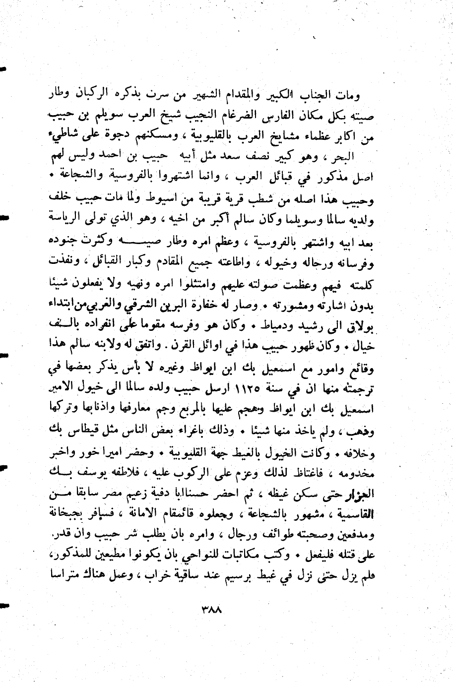 ومات الجناب الكبير والمقدام الشهير من سرت بذكره الركبان وطار صيته بكل مكان الفارس الضرغام النجيب شيخ العرب سويلم بن حبيب من أكابر عظماء مشايخ العرب بالقليوبية ومسكنهم دجوة على شاطيء البحر وهو كبير نصف سعد مثل أبيه حبيب بن أحمد وليس لهم أصل مذكور في قبائل العرب وإنما اشتهروا بالفروسية والشجاعة. وحبيب هذا أصله من شطب قرية قريبة من اسيوط ولما مات حبيب خلف ولديه سالما وسويلما وكان سالم أكبر من أخيه وهو الذي تولى الرياسة بعد أبيه واشتهر بالفروسية وعظم امره وطار صيته وكثرت جنوده وفرسانه ورحاله وخيوله واطاعته جميع المقادم وكبار القبائل ونفذت كلمته فيهم وعظمت صولته عليهم وامتثلوا أمره ونهيه ولا يفعلون شيئا بدون اشارته ومشورته. صار له خفارة البرين الشرقي والغربي من ابتداء بولاق إلى رشيد ودمياط. وكان هو وفرسه مقوما على انفراده بالف خيال. وكان ظهور حبيب هذا في أوائل القرن. واتفق له ولابنه سالم هذا وقائع وأمور مع إسمعيل بك ابن ايواظ وغيره لا بأس يذكر بعضها في ترجمته منها أن في سنة 1125 أرسل حبيب ولده سالما إلى خيول الأمير إسمعيل بك ابن ايواظ وهجم عليها بالمربع وجم معارفها واذنابها وتركها وذهب ولم ياخذ منها شيئا. وذلك باغراء بعض الناس مثل قيطاس بك وخلافه. وكانت الخيول بالغيط جهة القليوبية. وحضر اميرا خور واخبر مخدومه فاغتاظ لذلك وعزم على الركوب عليه فلاطفه يوسف بك الجزار حتى سكن غيظه ثم أحضر حسنا أبا دفية زعيم مصر سابقا من القاسمية مشهور بالشجاعة وجعلوه قائمقام الأمانة فسافر بجبخانة ومدفعين وصحبته طوائف ورجال وأمره بان يطلب شر حبيب وإن قدر على قتله فليفعل. وكتب مكاتبات للنواحي بان يكونوا مطيعين للمذكور فلم يزل حتى نزل في غيط برسيم عند ساقية خراب وعمل هناك متراسا