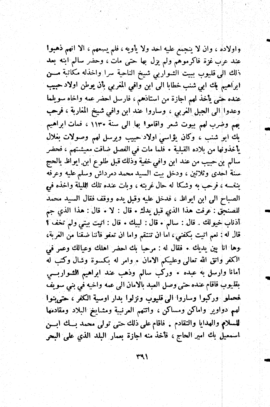 واولاده وإن لا ينجمع عليه أحد ولا يأويه فلم يسعهم إلا أنهم ذهبوا عند عرب غزة فاكرموهم ولم يزل بها حتى مات وحضر سالم ابنه بعد ذلك إلى قليوب ببيت الشواربي شيخ الناحية سرا واخذله مكاتبة من إبراهيم بك أبي شنب خطابا إلى ابن وافي المغربي بأن يوطن أولاد حبيب عنده حتى يأخذ لهم اجازة من أستاذهم فأرسل أحضر عمه واخاه سويلما وعدوا إلى الجبل الغربي وساروا عند ابن وافي شيخ المغاربة فرحب بهم وضرب لهم بيوت شعر وأقاموا بها إلى سنة 1130 فمات إبراهيم بك أبو شنب وكان يؤاسي أولاد حبيب ويرسل لهم وصولات بغلال يأخذونها من بلاده القبلية. فلما مات في الفصل ضاقت معيشتهم فحضر سالم بن حبيب من عند ابن وافي خفية وذلك قبل طلوع ابن ايواظ بالحج سنة أحدى وثلاثين ودخل بيت السيد محمد دمرداش وسلم عليه وعرفه بنفسه فرحب به وشكا له حال غربته وبات عنده تلك الليلة واخذه في الصباح إلى ابن ايواظ فدخل عليه وقبل يده ووقف فقال السيد محمد للصنجق: عرفت هذا الذي قبل يدك. قال: لا. قال: هذا الذي جم أذناب خيولك. قال: سالم. قال: لبيك. قال: اتيت بيتي ولم تخف قال له: نعم اتيت بكفني اما أن تنتقم وأما أن تعفو فأننا ضقنا من الغربة وها أنا بين يديك. فقال له: مرحبا بك أحضر أهلك وعيالك وعمر في الكفر واتق الله تعالى وعليكم الامان. وامر له بكسوة وشال وكتب له أمانا وأرسل به عبده. وركب سالم وذهب عند إبراهيم الشواربي بقليوب فاقام عنده حتى وصل العبد بالأمان إلى عمه واخيه في بني سويف فحملوا وركبوا وساروا إلى قليوب ونزلوا بدار اوسية الكفر حتى بنوا لهم دواوير واماكن ومساكن واتتهم العرنبية ومشايخ البلاد ومقادمها للسلام والهدايا والتقادم. فأقام على ذلك حتى تولى محمد بك ابن إسمعيل بك أمير الحاج فأخذ منه اجازة بعمار البلد الذي على البحر