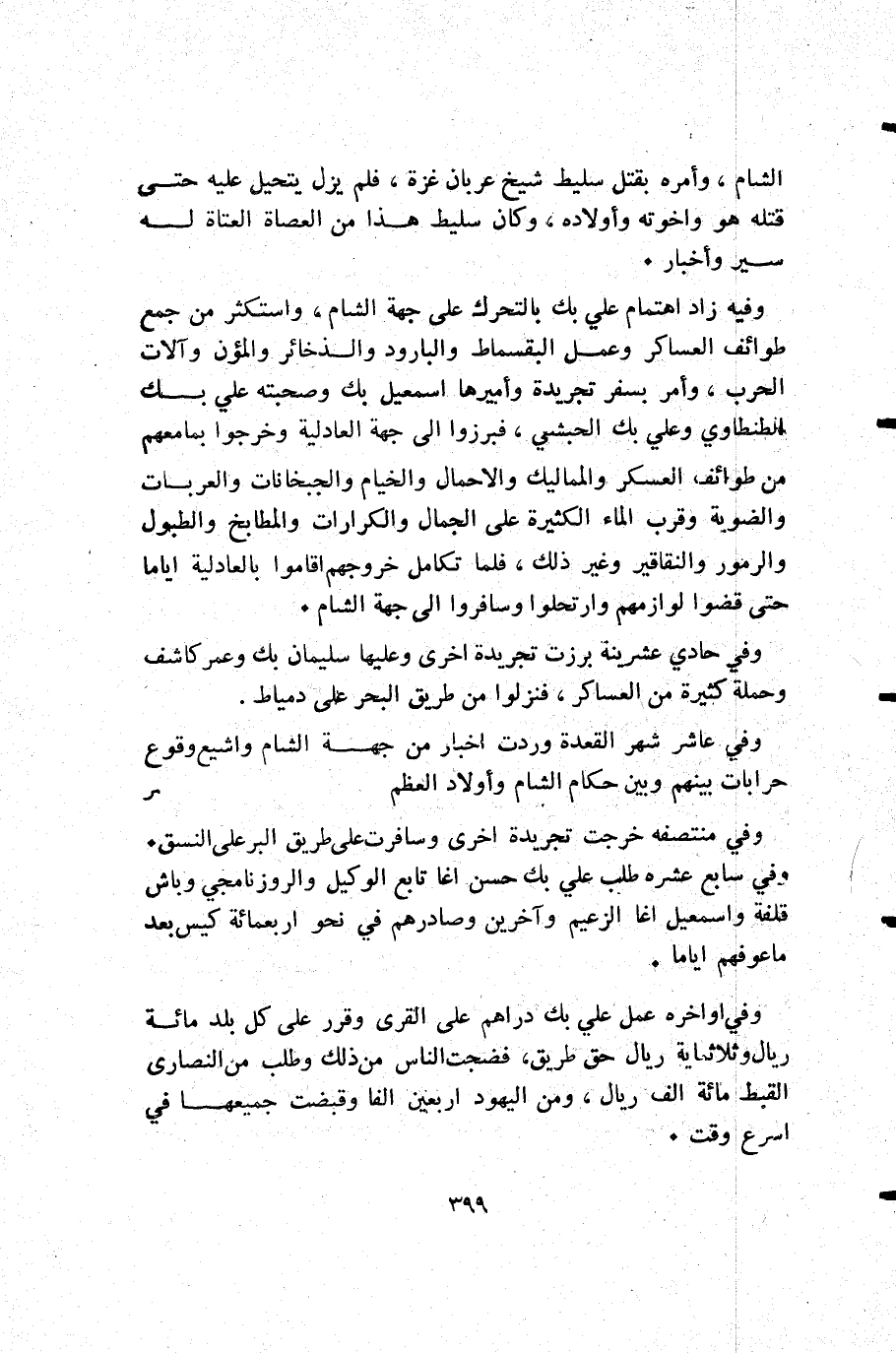 وفي أواخره عمل علي بك دراهم على القرى وقرر على كل بلد مائة ريال وثلاثمائة ريال حق طريق فضجت الناس من ذلك وطلب من النصارى القبط مائة ألف ريال ومن اليهود أربعين الفا وقبضت جميعها في أسرع وقت.