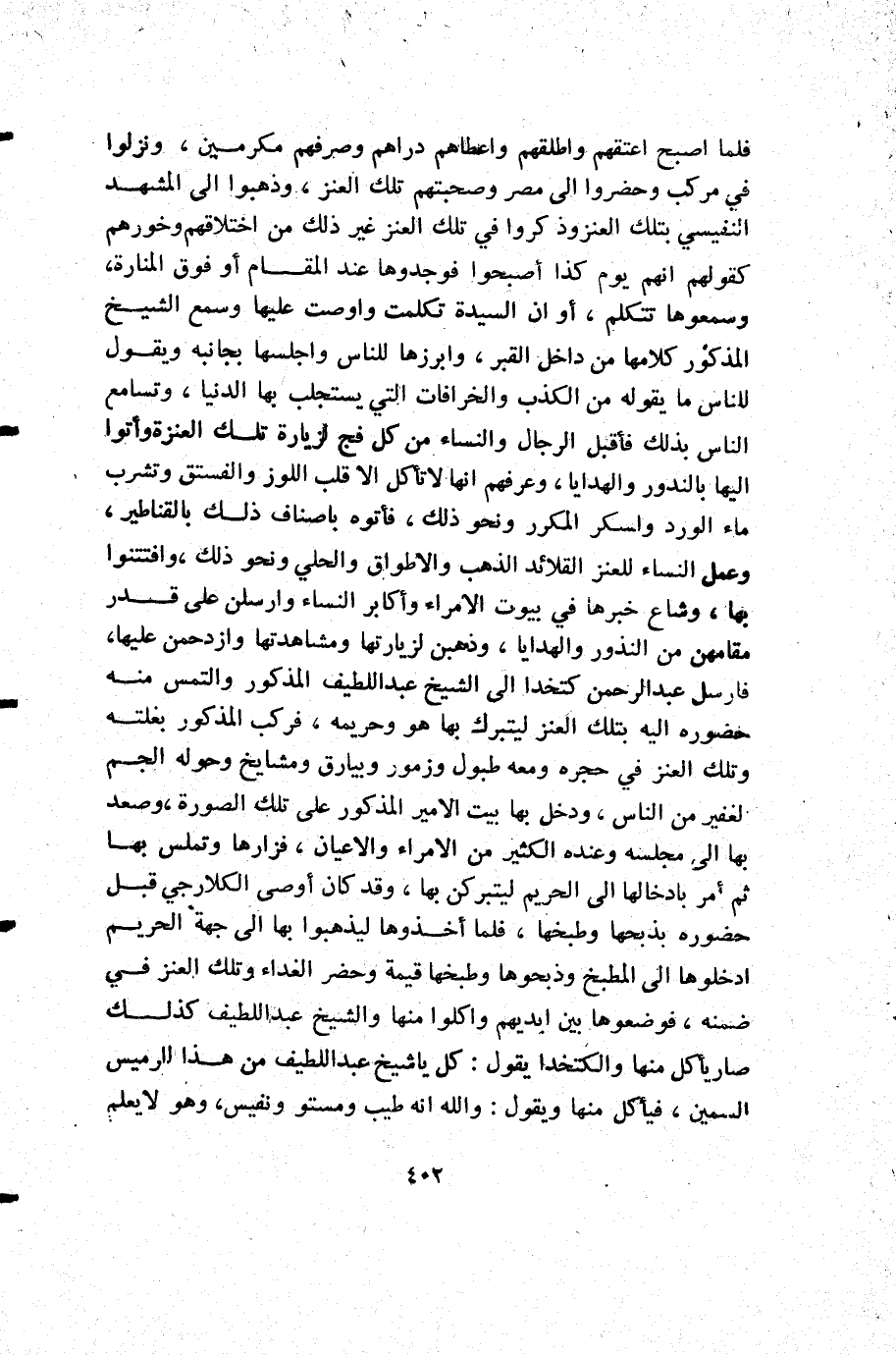 فلما أصبح اعتقهم واطلقهم واعطاهم دراهم وصرفهم مكرمين ونزلوا في مركب وحضروا إلى مصر وصحبتهم تلك العنز وذهبوا إلى المشهد النفيسي بتلك العنز وذكروا في تلك العنز غير ذلك من اختلاقهم وخورهم كقولهم أنهم يوم كذا أصبحوا فوجدوها عند المقام أو فوق المنارة وسمعوها تتكلم أو أن السيدة تكلمت وأوصت عليها وسمع الشيخ المذكور كلامها من داخل القبر وابرزها للناس واجلسها بجانبه ويقول للناس ما يقوله من الكذب والخرافات التي يستجلب بها الدنيا وتسامع الناس بذلك فأقبل الرجال والنساء من كل فج لزيارة تلك العنزة وأتوا إليها بالندور والهدايا وعرفهم انها لا تأكل إلا قلب اللوز والفستق وتشرب ماء الورد والسكر المكرر ونحو ذلك فأتوه باصناف ذلك بالقناطير وعمل النساء للعنز القلائد الذهب والاطواق والحلي ونحو ذلك وافتتنوا بها وشاع خبرها في بيوت الأمراء وأكابر النساء وأرسلن على قدر مقامهن من النذور والهدايا وذهبن لزيارتها ومشاهدتها وازدحمن عليها فأرسل عبد الرحمن كتخدا إلى الشيخ عبد اللطيف المذكور والتمس منه حضوره إليه بتلك العنز ليتبرك بها هو وحريمه فركب المذكور بغلته وتلك العنز في حجره ومعه طبول وزمور وبيارق ومشايخ وحوله الجسم الغفير من الناس ودخل بها بيت الأمير المذكور على تلك الصورة وصعد بها إلى مجلسه وعنده الكثير من الأمراء والأعيان فزارها وتملس بها ثم أمر بادخالها إلى الحريم ليتبركن بها وقد كان أوصى الكلارجي قبل حضوره بذبحها وطبخها فلما أخذوها ليذهبوا بها إلى جهة الحريم ادخلوها إلى المطبخ وذبحوها وطبخها قيمة وحضر الغداء وتلك العنز في ضمنه فوضعوها بين ايديهم وأكلوا منها والشيخ عبد اللطيف كذلك صار يأكل منها والكتخدا يقول كل يا شيخ عبد اللطيف من هذا للرميس السيمن فيأكل منها ويقول: والله أنه طيب ومستو ونفيس وهو لا يعلم