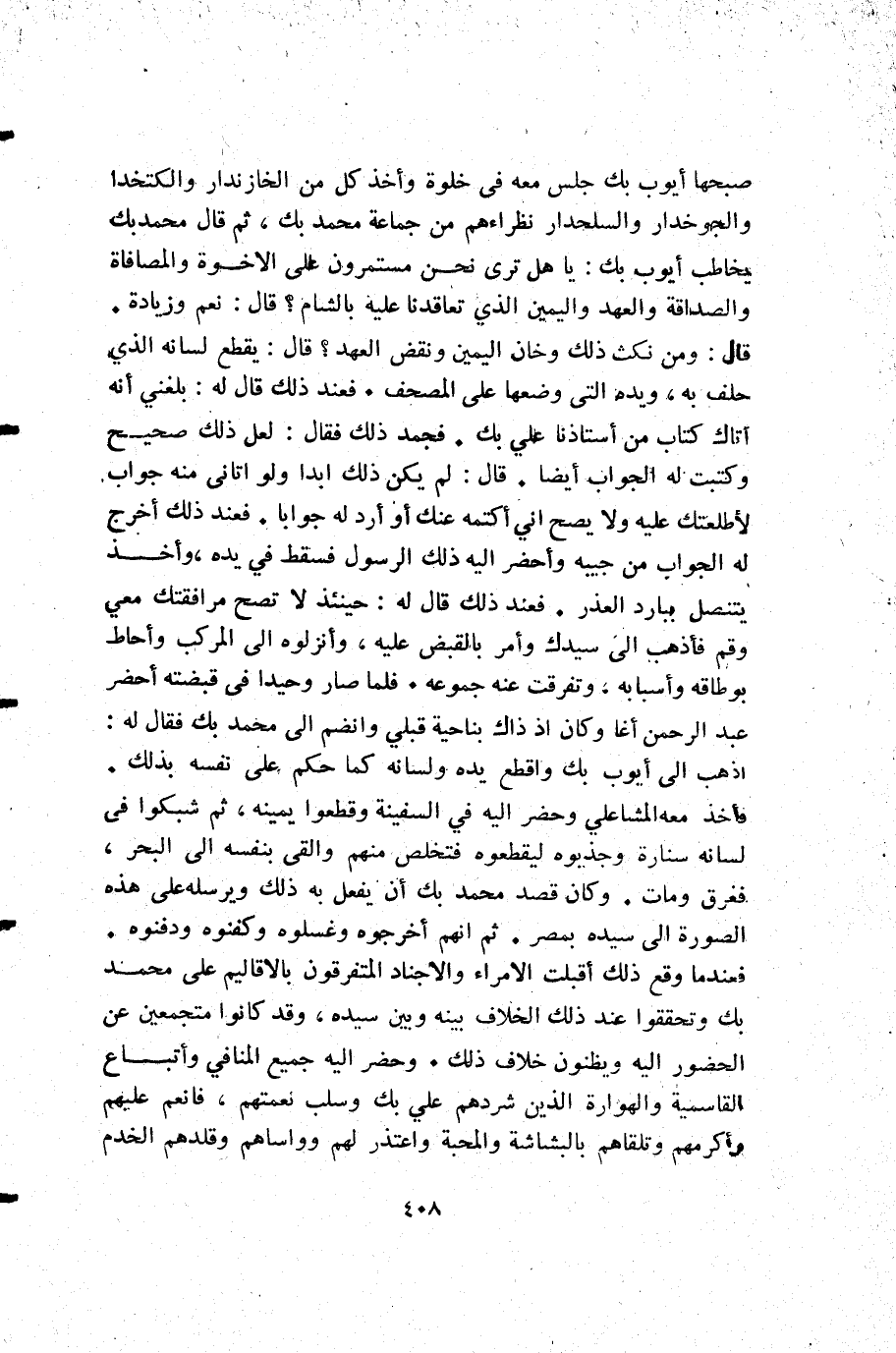 صبحها أيوب بك جلس معه في خلوة وأخذ كل من الخازندار والكتخدا والجوخدار والسلحدار نظراءهم من جماعة محمد بك ثم قال محمد بك يخاطب أيوب بك: يا هل ترى نحن مستمرون على الاخوة والمصافاة والصداقة والعهد واليمين الذي تعاقدنا عليه بالشام قال: نعم وزيادة. قال: ومن نكث ذلك وخان اليمين ونقض العهد قال: يقطع لسانه الذي حلف به ويده التي وضعها على المصحف. فعند ذلك قال له: بلغني أنه أتاك كتاب من أستاذنا علي بك. فجمد ذلك فقال: لعل ذلك صحيح وكتبت له الجواب أيضا. قال: لم يكن ذلك ابدا ولو اتاني منه جواب لأطلعتك عليه ولا يصح إني أكتمه عنك أو أرد له جوابا. فعند ذلك أخرج له الجواب من جيبه وأحضر إليه ذلك الرسول فسقط في يده وأخذ ينتنصل ببادر العذر. فعند ذلك قال له: حينئذ لا تصح مرافقتك معي وقم فأذهب إلى سيدك وأمر بالقبض عليه وأنزلوه إلى المركب وأحاط بوطاقه وأسبابه وتفرقت عنه جموعه. فلما صار وحيدا في قبضته أحضر عبد الرحمن أغا وكان إذ ذاك بناحية قبلي وانضم إلى محمد بك فقال له: اذهب إلى أيوب بك واقطع يده ولسانه كما حكم على نفسه بذلك. فأخذ معه المشاعلي وحضر إليه في السفينة وقطعوا يمينه ثم شبكوا في لسانه سنارة وجذبوه ليقطعوه فتخلص منهم والقى بنفسه إلى البحر فغرق ومات. وكان قصد محمد بك أن يفعل به ذلك ويرسله على هذه الصورة إلى سيده بمصر. ثم إنهم أخرجوه وغسلوه وكفنوه ودفنوه. فعندما وقع ذلك أقبلت الأمراء والاجناد المتفرقون بالأقاليم على محمد بك وتحققوا عند ذلك الخلاف بينه وبين سيده وقد كانوا متجمعين عن الحضور إليه ويظنون خلاف ذلك. وحضر إليه جميع المنافي وأتباع القاسمية والهوارة الذين شردهم علي بك وسلب نعمتهم فانعم عليهم وأكرمهم وتلقاهم بالبشاشة والمحبة واعتذر لهم وواساهم وقلدهم الخدم