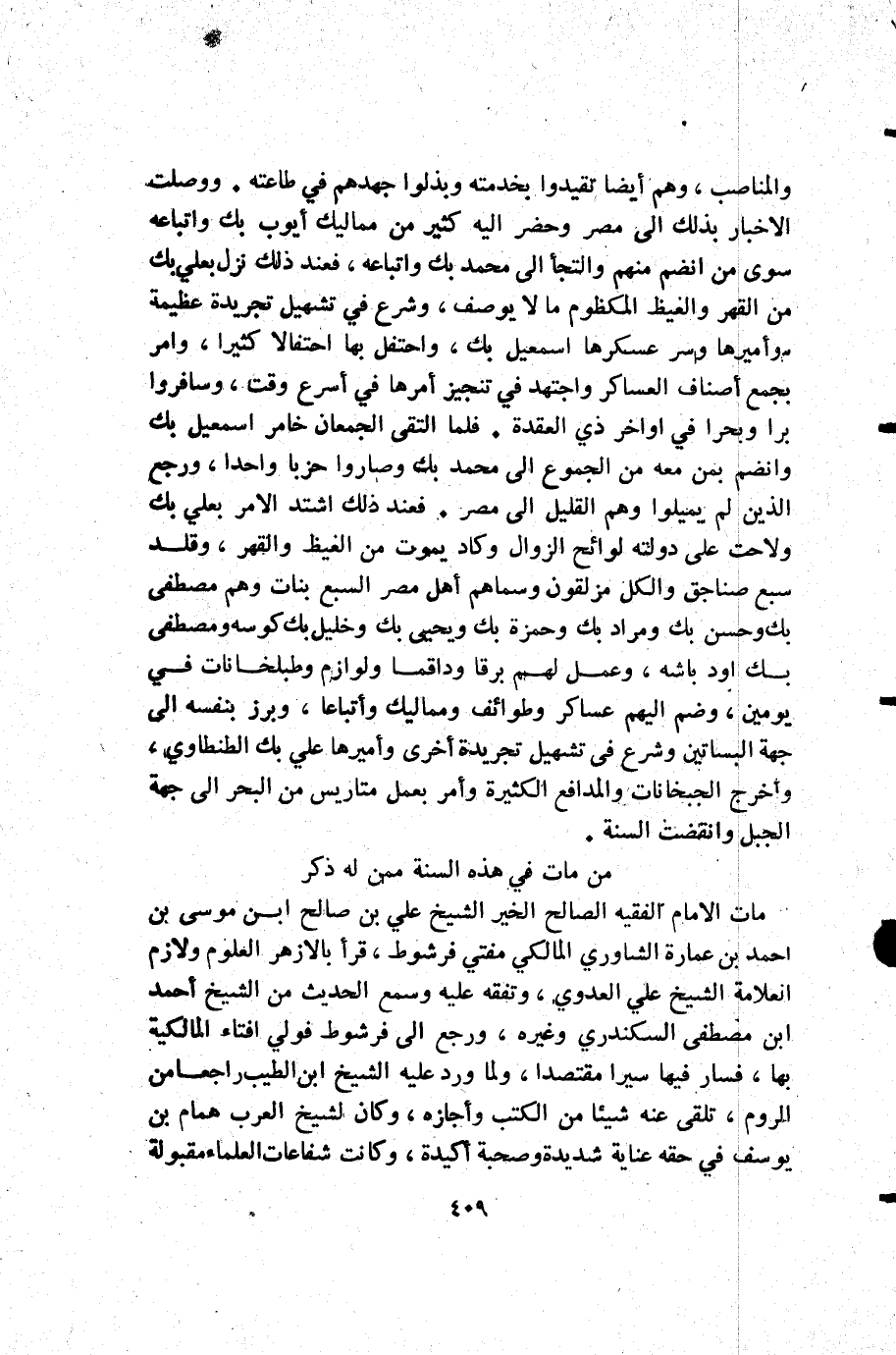 والمناصب وهم أيضا تقيدوا بخدمته وبذلوا جهدهم في طاعته. ووصلت الأخبار بذلك إلى مصر وحضر إليه كثير من مماليك أيوب بك واتباعه سوى من انضم منهم والتجأ إلى محمد بك واتباعه فعند ذلك نزل بعلي بك من القهر والغيظ المكظوم ما لا يوصف وشرع في تشهيل تجريدة عظيمة وأميرها وسر عسكرها إسمعيل بك واحتفل بها احتفالا كثيرا وأمر بجمع أصناف العساكر واجتهد في تنجيز أمرها في أسرع وقت وسافروا برا وبحرا في أواخر ذي القعدة. فلما التقى الجمعان خامر إسمعيل بك وانضم بمن معه من الجموع إلى محمد بك وصاروا حزبا واحدا ورجع الذين لم يميلوا وهم القليل إلى مصر. فعند ذلك اشتد الأمر بعلي بك ولاحت على دولته لوائح الزوال وكاد يموت من الغيظ والقهر وقلد سبع صناجق والكل مزلقون وسماهم أهل مصر السبع بنات وهم مصطفى بك وحسن بك ومراد بك وحمزة بك ويحيى بك وخليل بك كوسه ومصطفى بك اود باشه وعمل لهم برقا وداقما ولوازم وطبلخانات في يومين وضم إليهم عساكر وطوائف ومماليك وأتباعا وبرز بنفسه إلى جهة البساتين وشرع في تشهيل تجريدة أخرى وأميرها علي بك الطنطاوي وأخرج الجبخانات والمدافع الكثيرة وأمر بعمل متاريش من البحر إلى جهة الجبل وانقضت السنة.