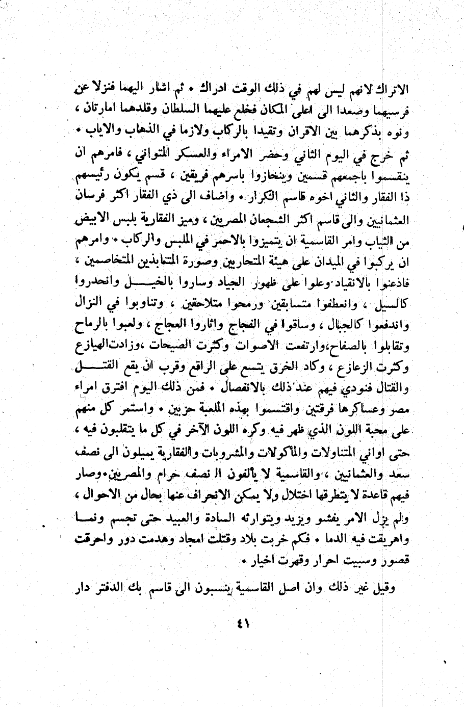 الأتراك لأنهم ليس لهم في ذلك الوقت إدراك. ثم أشار اليهما فنزلا عن فرسيهما وصعدا إلى أعلى المكان فخلع عليهما السلطان وقلدهما إمارتان ونوه بذكرهما بين الاقران وتقيدا بالركاب ولازما في الذهاب والإياب. ثم خرج في اليوم الثاني وحضر الأمراء والعسكر المتواني فامرهم أن ينقسموا باجمعهم قسمين وينحازوا باسرهم فريقين قسم يكون رئيسهم ذا الفقار والثاني أخوه قاسم الكرار. واضاف إلى ذي الفقار أكثر فرسان العثمانيين وإلى قاسم أكثر الشجعان المصريين وميز الفقارية بلبس الأبيض من الثياب وأمر القاسمية أن يتميزوا بالأحمر في الملبس والركاب. وأمرهم أن يركبوا في الميدان على هيئة المتحاربين وصورة المتنابذين المتخاصمين فاذعنوا بالانقياد وعلوا على ظهور الجياد وساروا بالخيل وانحدروا كالسيل وانعفوا متسابقين ورمحوا متلاحقين وتناوبوا في النزال واندفعوا كالجبال وساقوا في الفجاج وأثاروا العجاج ولعبوا بالرماح وتقابلوا بالصفاح وارتفعت الأصوات وكثرت الصيحات وزادت الهيازع وكثرت الزعازع وكاد الخرق يتسع على الراقع وقرب أن يقع القتل والقتال فنودي فيهم عند ذلك بالانفصال. فمن ذلك اليوم افترق أمراء مصر وعساكرها فرقتين واقتسموا بهذه الملعبة حزبين. واستمر كل منهم على محبة اللون الذي ظهر فيه وكره اللون الآخر في كل ما يتقبلون فيه حتى أواني المتناولات والمأكولات والمشروبات والفقارية يميلون إلى نصف سعد والعثمانيين والقاسمية لا يألفون إلى نصف حرام والمصريين. وصار فيهم قاعدة لا يتطرقها اختلال ولا يمكن الانحراف عنها بحال من الأحوال ولم يزل الأمر يفشو ويزيد ويتوارثه السادة والعبيد حتى تجسم ونما واهريقت فيه الدماء. فكم خربت بلاد وقتلت امجاد وهدمت دور واحرقت قصور وسبيت احرار وقهرت اخيار.