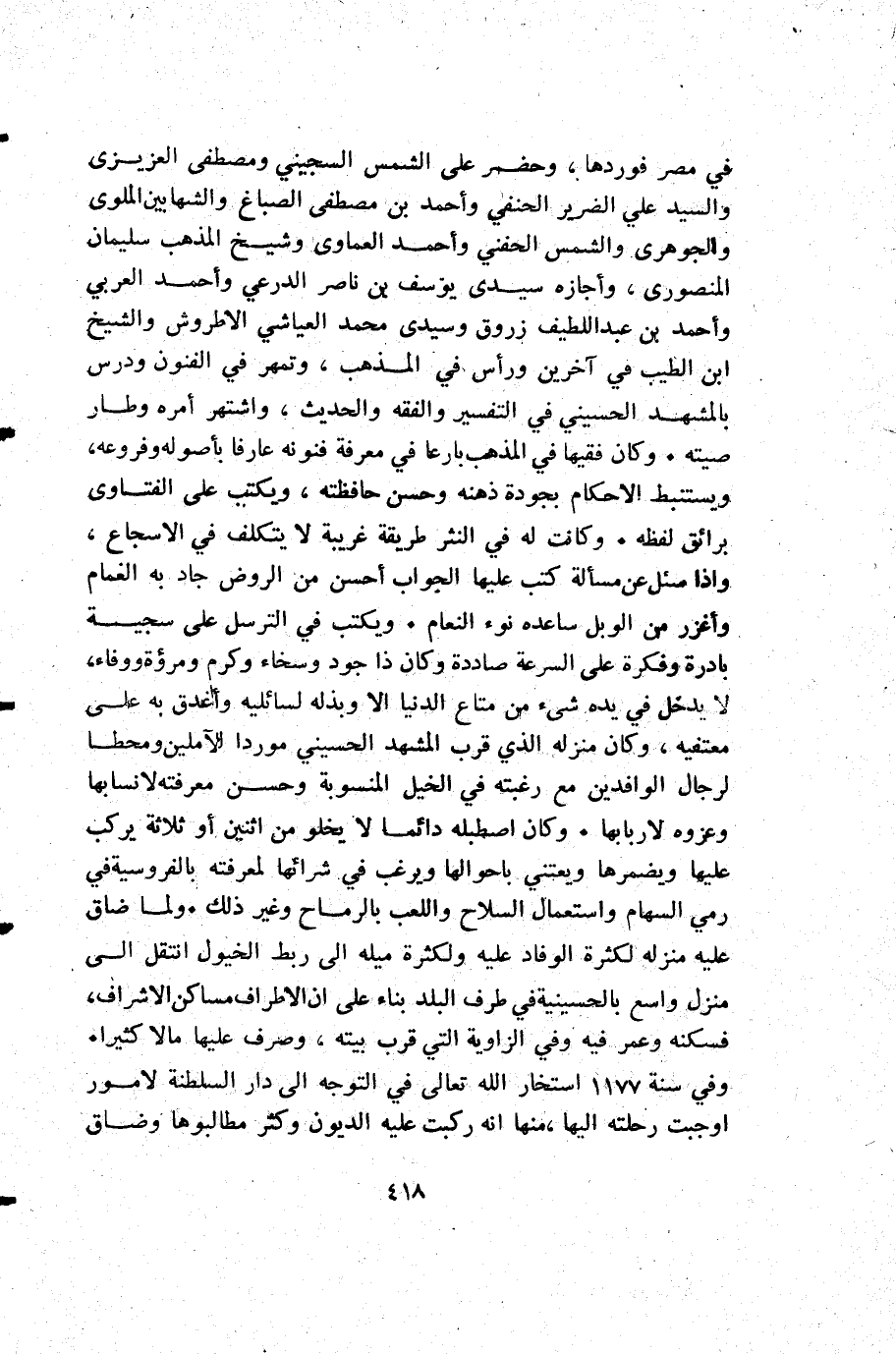 في مصر فوردها وحضر على الشمس السجيني ومصطفى العزيزي والسيد علي الضرير الحفني وأحمد بن مصطفى الصباغ والشهابين الملوي والجوهري والشمس الحنفي وأحمد العماوي وشيخ المذهب سليمان المنصوري وأجازه سيدي يوسف بن ناصر الدرعي وأحمد العربي وأحمد بن عبد اللطيف زروق وسيدي محمد العياشي الاطروش والشيخ ابن الطيب في آخرين ورأس في المذهب وتمهر في الفنون ودرس بالمشهد الحسيني في التفسير والفقه والحديث واشتهر أمره وطار صيته. وكان فقيها في المذهب بارعا في معرفة فنونه عارفا بأصوله وفروعه ويستنبط الأحكام بجودة ذهنه وحسن حافظته ويكتب على الفتاوى برائق لفظه. وكانت له في النثر طريقة غريبة لا يتكلف في الأسجاع وإذا سئل عن مسألة كتب عليها الجواب أحسن من الروض جاد به الغمام وأغزر من الوبل ساعده نوء النعام. ويكتب في الترسل على سجية بادرة وفكرة على السرعة صاددة وكان ذا جود وسخاء وكرم ومرؤة ووفاء لا يدخل في يده شىء من متاع الدنيا إلا وبذله لسائليه وأغدق به على معتفيه وكان منزله الذي قرب المشهد الحسيني مورد الآملين ومحطا لرجال الوافدين مع رغبته في الخيل المنسوبة وحسن معرفته لانسابها وعزوه لأربابها وكان اصطبله دائما لا يخلو من اثنين أو ثلاثة يركب عليها في شرائها لمعرفته بالفروسية في رمي السهام واستعمال السلاح واللعب بالرماح وغير ذلك. ولما ضاق عليه منزله لكثرة الوفاد عليه ولكثرة ميله إلى ربط الخيول انتقل إلى منزل واسع بالحسينية في طرف البلد بناء على أن الاطراف مساكن الأشراف فسكنه وعمر فيه وفي الزاوية التي قرب بيته وصرف عليها مالا كثيرا. وفي سنة 1177 استخار الله تعالى في التوجه إلى دار السلطنة لامور اوجبت رحلته إليها منها أنه ركبت عليه الديون وكثر مطالبوها وضاق