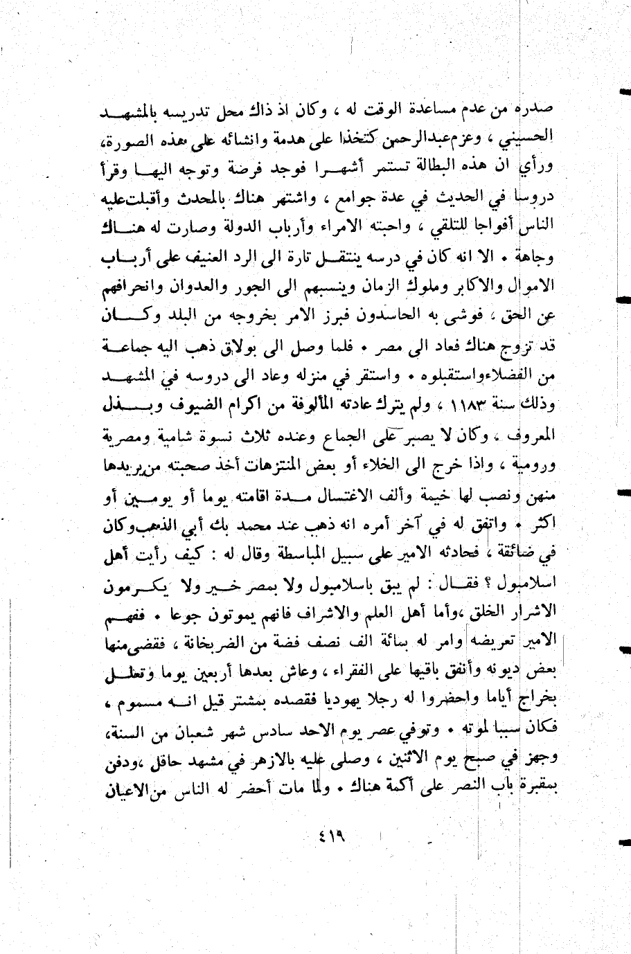 صدره من عدم مساعدة الوقت له وكان إذ ذاك محل تدريسه بالمشهد الحسيني وعزم عبد الرحمن كتخدا على هدمة وانشائه على هذه الصورة ورأي أن هذه البطالة تستمر أشهرا فوجد فرصة وتوجه إليها وقرأ دروسا في الحديث في عدة جوامع واشتهر هناك بالمحدث وأقبلت عليه الناس أفواجا للتلقي واحبته الأمراء وأرباب الدولة وصارت له هناك وجاهة. الا أنه كان في درسه ينتقل تارة إلى الرد العنيف على أرباب الأموال والاكابر وملوك الزمان وينسبهم إلى الجور والعدوان وانحرافهم عن الحق فوشي به الحاسدون فبرز الأمر بخروجه من البلد وكان قد تزوج هناك فعاد إلى مصر. فلما وصل إلى بولاق ذهب إليه جماعة من الفضلاء واستقبلوه. واستقر في منزله وعاد إلى دروسه في المشهد وذلك سنة 1183 ولم يترك عادته المألوفة من أكرام الضيوف وبذل المعروف وكان لا يصبر على الجماع وعنده ثلاث نسوة شامية ومصرية ورومية وإذا خرج إلى الخلاء أو بعض المنتزهات أخذ صحبته من يريدها منهن ونصب لها خيمة وألف الأغتسال مدة اقامته يوما أو يومين أو أكثر. واتفق له في آخر أمره أنه ذهب عند محمد بك أبي الذهب وكان في ضائقة فحادثه الأمير على سبيل المباسطة وقال له: كيف رأيت أهل اسلامبول فقال: لم يبق باسلامبول ولا بمصر خير ولا يكرمون الأشرار الخلق وأما أهل العلم والاشراف فإنهم يموتون جوعا. ففهم الأمير تعريضه وأمر له بمائة ألف نصف فضة من الضربخانة فقضى منها بعض ديونه وأنفق باقيها على الفقراء وعاش بعدها أربعين يوما وتعلل بخراج أياما واحضروا له رجلا يهوديا فقصده بمشتر قيل: إنه مسموم فكان سببا لموته. وتوفي عصر يوم الأحد سادس شهر شعبان من السنة وجهز في صبح يوم الإثنين وصلى عليه بالأزهر في مشهد حافل ودفن بمقبرة باب النصر على أكمة هناك. ولما أحضر له الناس من الأعيان