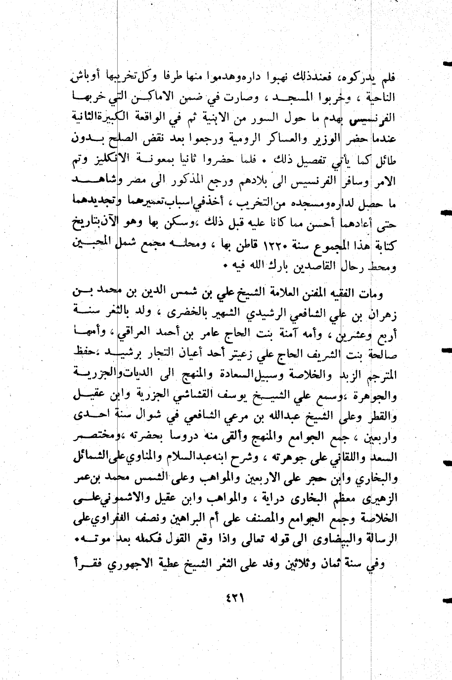فلم يدركوه فعند ذلك نهبوا داره ودهموا منها طرفا وكل تخريبها أوباش الناحية وخربوا المسجد وصارت في ضمن الاماكن التي خربها الفرنسيس بهدم ما حول السور من الأبنية ثم في الواقعة الكبيرة الثانية عندما حضر الوزير والعساكر الرومية ورجعوا بعد نقض الصلح بدون طائل كما يأتي تفصيل ذلك. فلما حضروا ثانيا بمعونة الانكليز وتم الأمر وسافر الفرنسيس إلى بلادهم ورجع المذكور إلى مصر وشاهد ما حصل لداره ومسجده من التخريب أخذ في اسباب تعميرهما وتجديدهما حتى أعادهما أحسن مما كانا عليه قبل ذلك وسكن بها وهو الآن بتاريخ كتابة هذا المجموع سنة 1220 قاطن بها ومحله مجمع شمل المحبين ومحط رحال القاصدين بارك الله فيه.