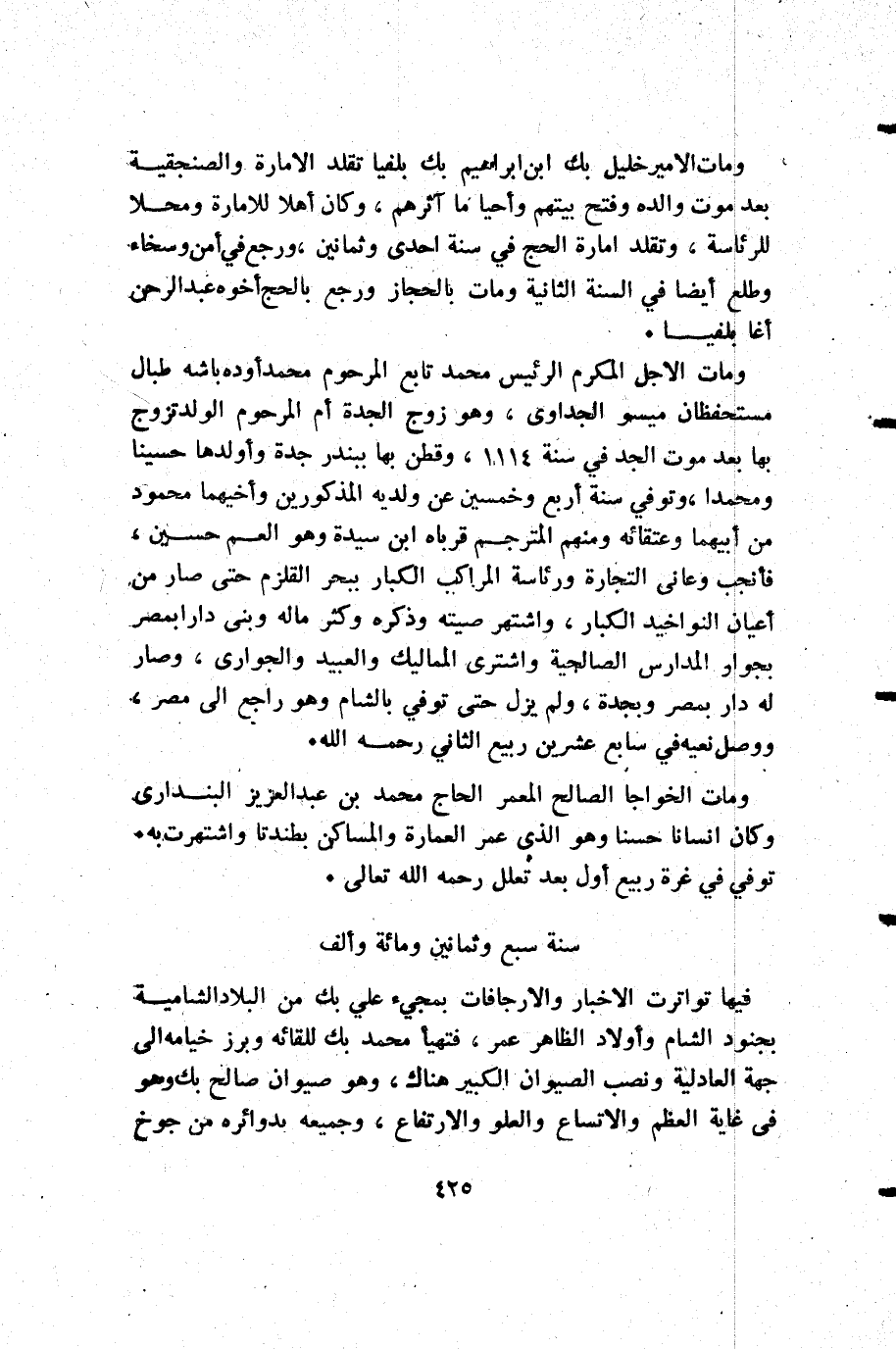 ومات الأمير خليل بك ابن إبراهيم بك بلفيا تقلد الإمارة والصنجقية بعد موت والده وفتح بيتهم وأحيا ما آثرهم وكان أهلا للإمارة ومحلا للرئاسة وتقلد إمارة الحج في سنة أحدى وثمانين ورجع في أمن وسخاء وطلع أيضا في السنة الثانية ومات بالحجاز ورجع بالحج أخوه عبد الرحمن أغا بلفيا.