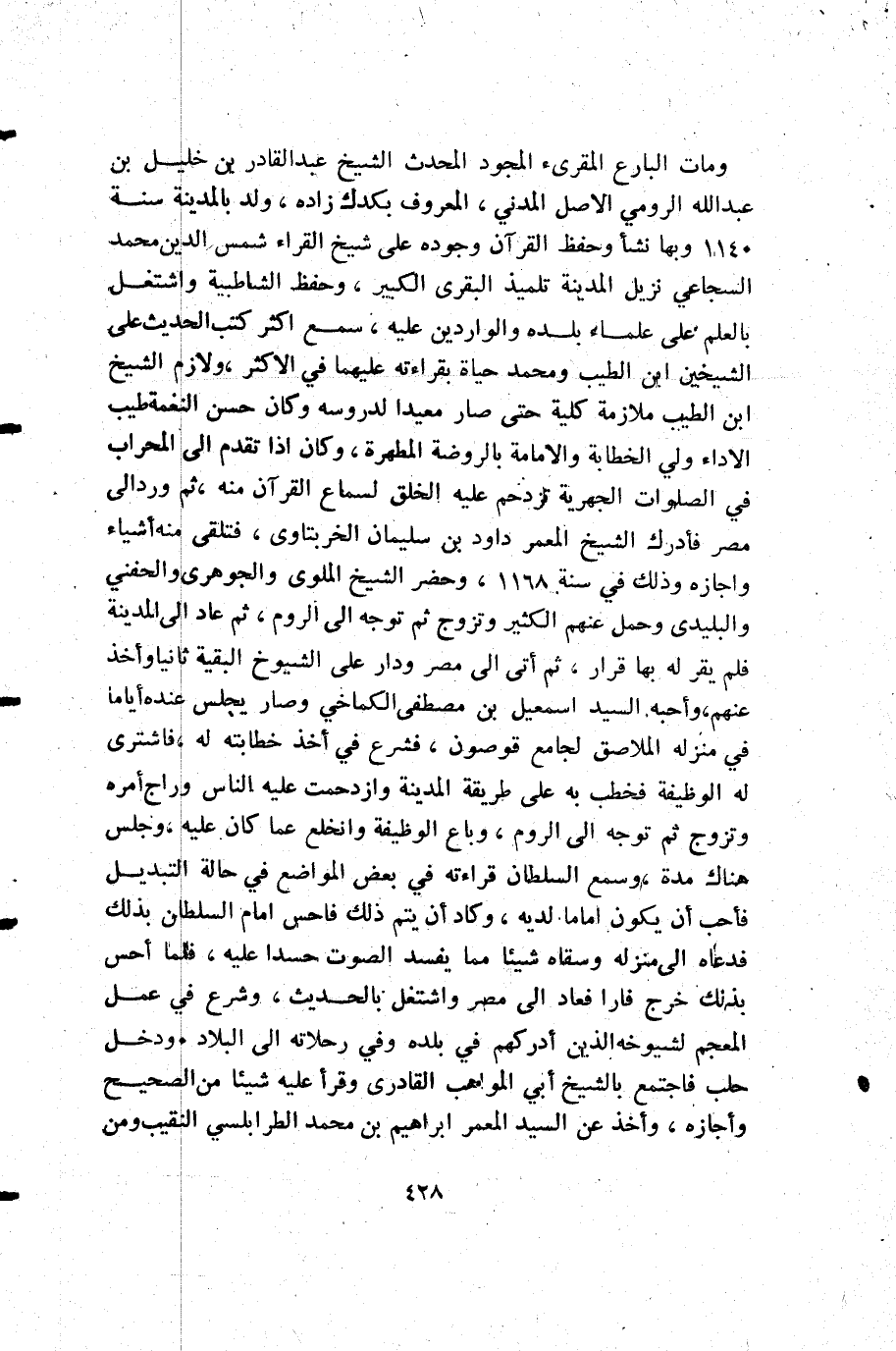 ومات البارع المقرىء المجود المحدث الشيخ عبد القادر بن خليل بن عبد الله الرومي المدني المعروف بكدك زاده ولد بالمدينة سنة 1140 وبها نشأ وحفظ القرآن وجوده على شيخ القراء شمس الدين محمد السجاعي نزيل المدينة تلميذ البقرى الكبير وحفظ الشاطبية واشتغل بالعلم على علماء بلده والواردين عليه سمع أكثر كتب الحديث على الشيخين ابن الطيب ومحمد حياة بقراءته عليهما في الأكثر ولازم الشيخ ابن الطيب ملازمة كلية حتى صار معيدا لدروسه وكان حسن النغمة طيب الأداء ولي الخطابة وال إمامة بالروضة المطهرة وكان إذا تقدم إلى المحراب في الصلوات الجهرية تزدحم عليه الخلق لسماع القرآن منه ثم ورد إلى مصر فأدرك الشيخ المعمر داود بن سلمان الخربتاى فتلقى منه أشياء واجازه وذلك في سنة 1168 وحضر الشيخ الملوى والجوهرى والحفني والبليدى وحمل عنهم الكثير وتزوج ثم توجه إلى الروم ثم عاد إلى المدينة فلم يقر له بها قرار ثم أتى إلى مصر ودار على الشيوخ البقية ثانيا وأخذ عنهم وأحبه السيد اسمعل بن مصطفى الكماخي وصار يجلس عنده أياما في منزله الملاصق لجامع قوصون فشرع في أخذ خطابته له فاشترى له الوظيفة فخطب به على طريقة المدينة وازدحمت عليه الناس وراج أمره وتزوج ثم توجه إلى الروم وباع الوظيفة وانخلع عما كان عليه وجلس هناك مدة وسمع السلطان قراءته في بعض المواضع في حالة التبديل فأحب أن يكون إماما لديه وكاد أن يتم فاحس إمام السلطان بذلك فدعاه إلى منزله وسقاه شيئا مما يفسد الصوت حسدا عليه فلما أحس بذلك خرج فارا فعاد إلى مصر واشتغل بالحديث وشرع في عمل المعجم لشيوخه الذين أدركهم في بلده وفي رحلاته إلى البلاد. ودخل حلب فاجتمع بالشيخ أبي المواهب القادرى وقرأ عليه شيئا من الصحيح وأجازه وأخذ عن السيد المعمر إبراهيم بن محمد الطرابلسي النقيب ومن