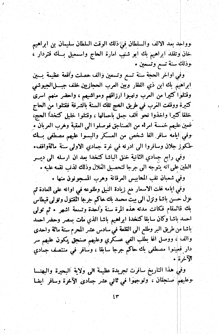 وواحد بعد الألف والسلطان في ذلك الوقت السلطان سليمان بن إبراهيم خان وتقلد إبراهيم بك أبو شنب إمارة الحاج وإسمعيل بك فتردار وذلك سنة تسع وتسعين.