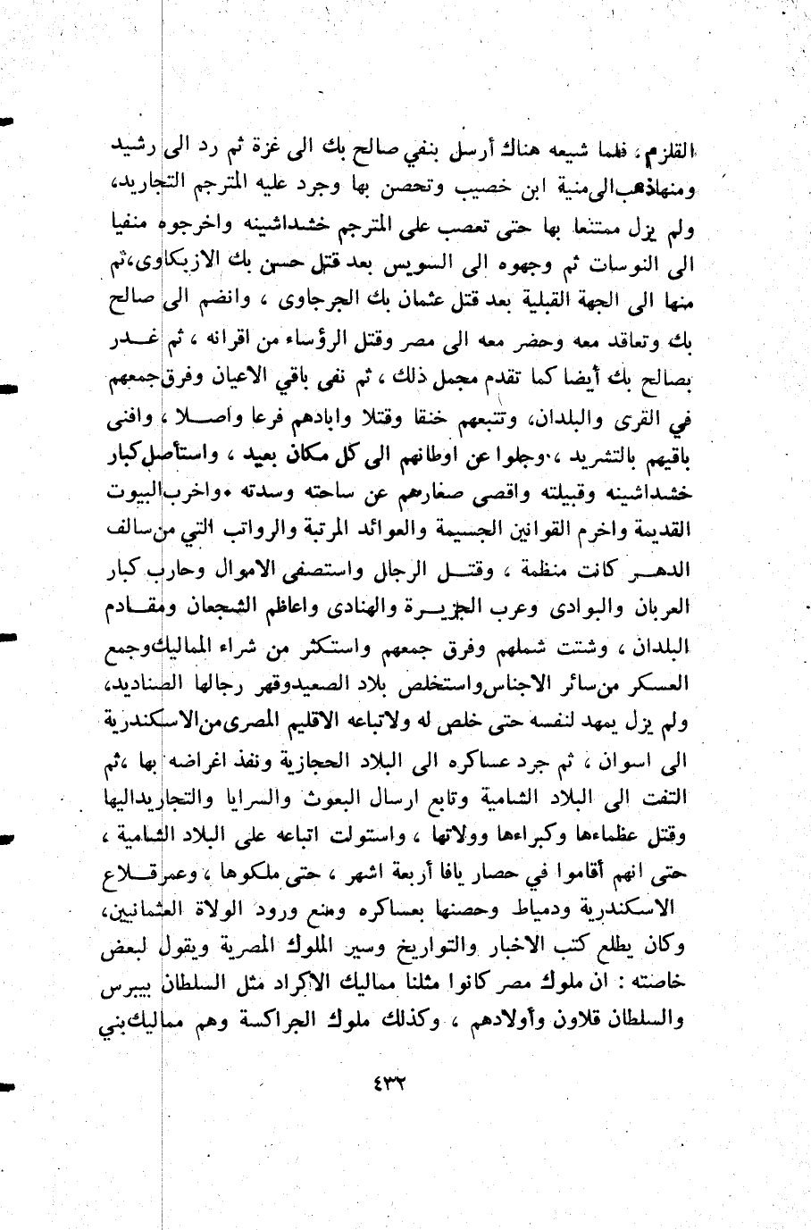 القلزم فلما شيعه هناك أرسل بنفي صالح بك إلى غزة ثم رد إلى رشيد ومنها ذهب إلى منية ابن خصيب وتحصن بها وجرد عليه المترجم التجاريد ولم يزل ممتنعا بها حتى تعصب على المترجم خشداشينه واخرجوه منفيا إلى النوسات ثم وجهوه إلى السويس بعد قتل حسن بك الأزبكاوى ثم منها إلى الجهة القبلية بعد قتل عثمان بك الجرجاوى وانضم إلى صالح بك وتعاقد معه وحضر معه إلى مصر وقتل الرؤساء من أقرانه ثم غدر بصالح بك أيضا كما تقدم مجمل ذلك ثم نفى باقي الأعيان وفرق جمعهم في القرى والبلدان وتتبعهم خنقا وقتلا وأبادهم فرعا وأصلا وافنى باقيهم بالتشريد وجلوا عن أوطانهم إلى كل مكان بعيد واستأصل كبار خشداشينة وقبيلته واقصى صغارهم عن ساحته وسدته. واخرب البيوت القديمة واخرم القوانين الجسيمة والعوائد المرتبة والرواتب التي من سالف الدهر كانت منظمة وقتل الرجال واستصفى الأموال وحارب كبار العربان والبوادي وعرب الجزيرة والهنادي واعاظم الشجعان ومقادم البلدان وشتت شملهم وفرق جمعهم واستكثر من شراء المماليك وجمع العسكر من سائر الأجناس واستخلص بلاد الصعيد وقهر رجالها الصناديد ولم يزل يمهد لنفسه حتى خلص له ولأتباعه الأقليم من الأسكندرية إلى أسوان ثم جرد عساكره إلى البلاد الحجازية ونفذ اغراضه بها ثم التفت إلى البلاد الشامية وتابع إرسال البعوث والسرايا والتجاريد إليها وقتل عظماءها وكبراءها وولاتها واستولت اتباعه على البلاد الشامية حتى أنهم أقاموا في حصار يافا أربعة أشهر حتى ملكوها وعمر قلاع الأسكندرية ودمياط وحصنها بعساكره ومنع ورود الولاة العثمانيين وكان يطلع كتب الأخبار والتواريخ وسير الملوك المصرية ويقول لبعض خاصته أن ملوك مصر كانوا مثلنا مماليك الأكراد مثل السلطان بيبرس والسلطان قلاوون وأولادهم وكذلك ملوك الجراكسة وهم مماليك بني