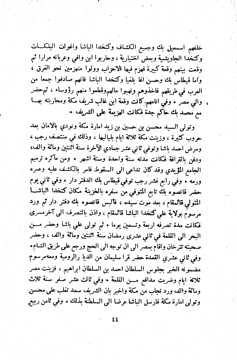 خلفهم إسمعيل بك وجميع الكشاف وكتخدا الباشا واغوات البلكات وكتخدا الجاويشية وبعض اختيارية وحاربوا ابن وافي وعربانه مرارا ثم وقعت بينهم وقعة كبيرة فهزم فيها الاحزاب وولوا منهزمين نحو الغرق وأما قيطاس بك وحسن اغا بليغا وكتخدا الباشا فإنهم صادفوا جمعا من العرب في طريقهم فأخذوهم ونهبوا مالهم وقطعوا منهم رؤوساء ثم حضر وإلى مصر. وفي انامهم كانت وقعة ابن غالب شريف مكة ومحاربته بها مع محمد بك حاكم جدة فكانت الهزيمة على الشريف.