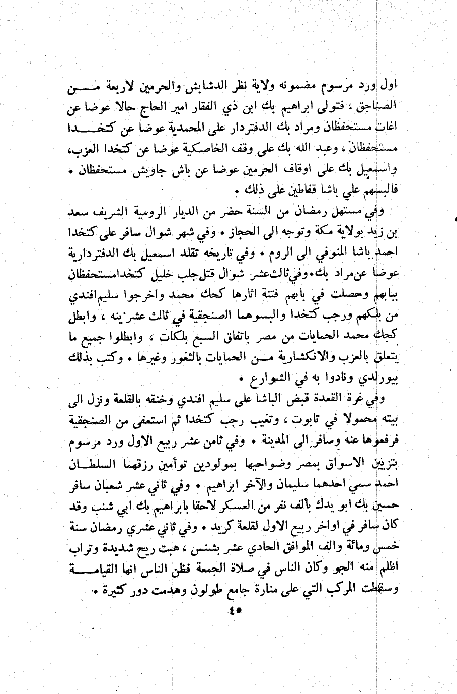 وفي غرة القعدة قبض الباشا على سليم افندي وخنقه بالقلعة ونزل إلى بيته محمولا في تابوت وتغيب رجب كتخدا ثم استعفى من الصنجقية فرفعوها عنه وسافر إلى المدينة. وفي ثامن عشر ربيع الأول ورد مرسوم بتزيين الأسواق بمصر وضواحيها بمولودين توأمين رزقهما السلطان أحمد سمي أحدهما سليان والآخر إبراهيم. وفي ثاني عشر شعبان سافر حسين بك أبو يدك بألف نفر من العسكر لاحقا بإبراهيم بك أبي شنب وقد كان سافر في أواخر ربيع الأول لقلعة كريد. وفي ثاني عشري رمضان سنة خمس ومائة وألف الموافق الحادي عشر بشنس هبت ريح شديدة وتراب أظلم منه الجو وكان الناس في صلاة الجمعة فظن الناس انها القيامة وسقطت المركب التي على منارة جامع طولون وهدمت دور كثيرة.