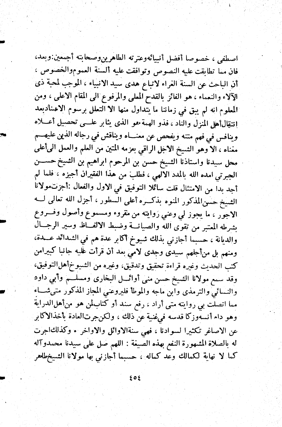 اصطفى خصوصا أفضل أنبيائه وعترته الطاهرين وصحابته أجمعين وبعد فإن مما تطابقت عليه النصوص وتوافقت عليه ألسنة العموم والخصوص أن الباحث عن ألسنة الغراء لأتباع هدى سيد الأنبياء الموجب لمحبة ذي الآلاء والنعماء هو الفائز بالقدح المعلى والمرفوع إلى المقام الأعلى ومن المعلوم أنه لم يبق في زماننا ما يتداول منها إلا التعلل برسوم الأسناد بعد انتقال أهل المنزل والناد فذو الهمة هو الذي يثابر على تحصيل أعلاه وينافس في فهم متنه ويفحص عن معناه ويناقش في رجاله الذين عليهم مغناه إلا وهو الشيخ الأجل الراقي بعزمه المتين من العلم والعمل إلى أعلى محل سيدنا وأستاذنا الشيخ حسن المرحوم إبراهيم بن الشيخ حسن الجبرتي أمده الله بالمدد الألهي فطلب من هذا الفقير أن أجيزه فلما لم أجد بدا من الأمتثال قلت سائلا التوفيق في الأول والفعال أجزت مولانا الشيخ حسن المذكور المنوه بذكره أعلى السطور أجزل الله تعالى له الأجور ما يجوز لي وعني روايته من مقروء ومسموع وأصول وفروع بشرطه المعتبر من تقوى الله والصيانة وضبط الألفاظ وسير الرجال والديانة حسبما أجازني بذلك شيوخ أكابر عدة هم في الشدائد عدة ومنهم بل من أجلهم سيدي وجدي لأمي بعد أن قرأت عليه جانبا كبيرا من كتب الحديث وغيره قراءة تحقيق وتدقيق وغيره من الشيوخ أهل التوفيق وقد سمع مولانا الشيخ حسن منى أوائل البخارى ومسلم وأبي داود والنسائي والترمذى وابن ماجه والموطأ فليروعني المجاز المذكور متى شاء مما اتصلت بي روايته متى أراد رفع سند أو كتاب لمن هو من أهل الدراية وهو دام أنسه وزكا قدسه في غنية عن ذلك ولكن جرت العادة بأخذ الأكابر عن الأصاغر تكثيرا لسوادنا فهي سنة الأوائل والأواخر. وكذلك اجرت له بالصلاة المشهورة النفع بهذه الصيغة اللهم صل على سيدنا محمد وآله كما لا نهاية لكمالك وعد كماله حسبما أجازني بها ملانا الشيخ طاهر