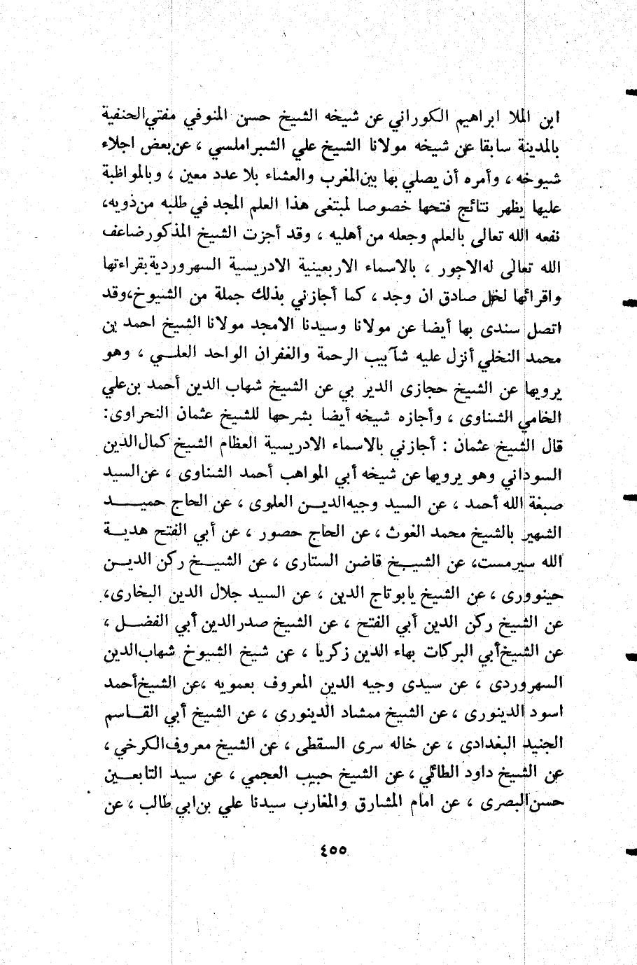ابن الملا إبراهيم الكوراني عن شيخه الشيخ حسن المنوفي مفتي الحنفية بالمدينة سابقا عن شيخه مولانا الشيخ علي الشبراملسي عن بعض اجلاء شيوخه وأمره أن يصلي بها بين المغرب والعشاء بلا عدد معين وبالمواظبة عليها يظهر نتائج فتحها خصوصا لمبتغى هذا العلم المجد في طلبه من ذويه نفعه الله تعالى بالعلم وجعله من أهل يه وقد أجزت الشيخ المذكور ضاعف الله تعالى له الأجور بالاسماء الأربعينية الادريسية السهروردية بقراءتها واقرائها لخل صادق أن وجد كما أجازني بذلك جملة من الشيوخ وقد اتصل سندي بها أيضا عن مولانا وسيدنا الامجد مولانا الشيخ أحمد بن محمد النخلي أنزل عليه شآبيب الرحمة والغفران الواحد العلي وهو يرويها عن الشيخ حجازي الديربي عن الشيخ شهاب الدين أحمد بن علي الخامي الشناوي وأجازه شيخه أيضا بشرحها للشيخ عثمان النحراوى قال الشيخ عثمان: أجازني بالاسماء الادريسية العظام الشيخ كمال الدين السوداني وهو يرويها عن شيخه أبي المواهب أحمد الشناوى عن السيد صبغة الله أحمد عن السيد وجيه الدين العلوى عن الحاج حميد الشهير بالشيخ محمد الغوث عن الحاج حصور عن أبي الفتح هدية الله سيرمست عن الشيخ قاضن الستارى عن الشيخ ركن الدين صينوورى عن الشيخ يابوتاج الدين عن السيد جلال الدين البخارى عن الشيخ ركن الدين أبي الفتح عن الشيخ صدر الدين أبي الفضل عن الشيخ أبي البركات بهاء الدين زكريا عن شيخ الشيوخ شهاب الدين السهروردى عن سيدي وجيه الدين المعروف بعمويه عن الشيخ أحمد اسود الدينوري عن الشيخ ممشاد الدينوري عن الشيخ أبي القاسم الجنيد البغدادى عن خاله سرى السقطى عن الشيخ معروف الكرخي عن الشيخ داود الطائي عن الشيخ حبيب العجمي عن سيد التابعين حسن البصري عن إمام المشارق والمغارب سيدنا علي بن أبي طالب عن