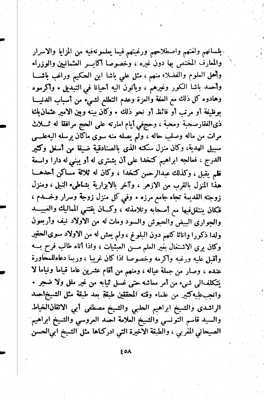 بلسانهم ولغتهم واصطلاحهم ورغبتهم فيما يعلمونه فيه من المزايا والاسرار والمعارف المختص بها دون غيره وخصوصا أكابر العثمانيين والوزراء وأهل العلوم والفضلاء منهم مثل علي باشا ابن الحكيم وراغب باشا وأحمد باشا الكور وغيرهم ويأتون إليه أحيانا في التبديل. وأكرموه وهادوه كل ذلك مع العفة والعزة وعدم التطلع لشيء من أسباب الدنيا بوظيفة أو مرتب أو فائظ أو نحو ذلك. وكان بينه وبين الأمير عثمان بك ذي الفقار صحبة ومحبة وحج في أيام إمارته على الحج مرافقا له ثلاث مرات من ماله وصلب حاله ولم يصله منه سوى ما كان يرسله إليه على سبيل الهدية وكان منزل سكنه الذي بالصنادقية ضيقا من أسفل وكثير الدرج فعالجه إبراهيم كتخدا على أن يشترى له أو يبني له دارا واسعة فلم يقبل وكذلك عبد الرحمن كتخدا وكان له ثلاثة مساكن أحدها هذا المنزل بالقرب من الأزهر وآخر بالابزارية بشاطىء النيل ومنزل زوجته القديمة تجاه جامع مرزه. وفي كل منزل زوجة وسرار وخدم فكان ينتقل فيها مع أصحابه وتلامذته وكان يقتني المماليك والعبيد والجوارى البيض والحبوش والسود ومات له من الأولاد نيف وأربعون ولدا ذكورا واناثا كلهم دون البلوغ ولم يعش له من الأولاد سوى الحقير وكان يرى الأشتغال بغير العلم من العبثيات وإذا أتاه طالب فرح به وأقبل عليه ورغبه وأكرمه وخصوصا إذا كان غريبا وربما دعاه للمحاورة عنده وصار من جملة عياله ومنهم من أقام عشرين عاما قياما ونياما لا يتكلف إلى شىء من أمر معاشه حتى غسل ثيابه من غير ملل ولا ضجر. وانجب عليه كثير من علماء وقته المحققين طبقة بعد طبقة مثل الشيخ أحمد الراشدى والشيخ إبراهيم الحلبي والشيخ مصطفى أبي الاتقان الخياط والسيد قاسم التونسي والشيخ العلامة أحمد العروسي والشيخ إبراهيم الصيحاني المغربي والطبقة الاخيرة التي ادركناها مثل الشيخ أبي الحسن