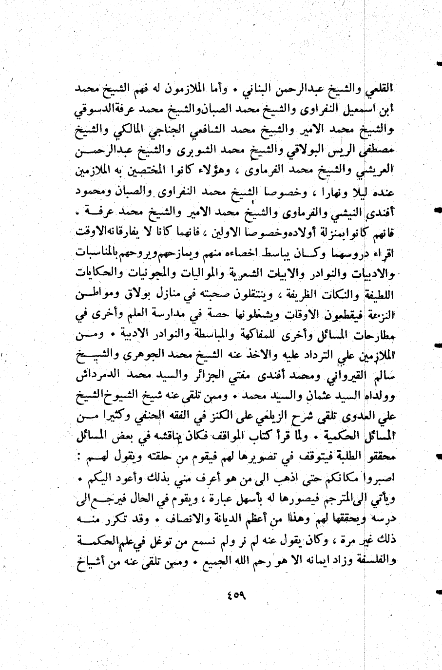 القلعي والشيخ عبد الرحمن البناني. وأما الملازمون له فهم الشيخ محمد ابن إسمعيل النفراوي والشيخ محمد الصبان والشيخ محمد عرفة الدسوقي والشيخ محمد الأمير والشيخ محمد الشافعي الجناجي المالكي والشيخ مصطفى الريس البولاقي والشيخ محمد الشوبري والشيخ عبد الرحمن العريشي والشيخ محمد الفرماوى وهؤلاء كانوا المختصين به الملازمين عنده ليلا ونهارا وخصوصا الشيخ محمد النفراوى والصبان ومحمود أفندي النيشي والفرماوى والشيخ محمد الأمير والشيخ محمد عرفة فإنهم كانوا بمنزلة أولاده خصوصا الأولين فانهما كانا لا يقارفانه إلا وقت اقراء دروسهما وكان يباسط اخصاءه منهم ويمازحهم ويروحهم بالمناسبات والأدبيات والنوادر والأبيات الشعرية والمواليات والمجونيات والحكايات اللطيفة والنكات الظريفة وينتقلون صحبته في منازل بولاق ومواطن النزهة فيقطعون الأوقات ويشغلونها حصة في مدارسة العلم وأخرى في مطارحات المسائل وأخرى للمفاكهة والمباسطة والنوادر الأدبية. ومن الملازمين على الترداد عليه والأخذ عنه الشيخ محمد الجوهرى والشيخ سالم القيرواني ومحمد أفندي مفتي الجزائر والسيد محمد الدمرداش وولداه السيد عثمان والسيد محمد. وممن تلقى عنه شيخ الشيوخ الشيخ علي العدوى تلقى شرح الزيلعي على الكنز في الفقه الحنفي وكثيرا من المسائل الحكمية. ولما قرأ كتاب المواقف فكان يناقشه في بعض المسائل محققو الطلبة فيتوقف في تصويرها لهم فيقوم من حلقته ويقول لهم: اصبروا مكانكم حتى اذهب إلى من هو أعرف مني بذلك وأعود اليكم. ويأتي إلى المترجم فيصورها له بأسهل عبارة ويقوم في الحال فيرجع إلى درسه ويحققها لهم وهذا من أعظم الديانة والانصاف. وقد تكرر منه ذلك غير مرة وكان يقول عنه: لم نر ولم نسمع من توغل في علم الحكمة والفلسفة وزاد إيمانه إلا هو رحم الله الجميع. وممن تلقى عنه من أشياخ