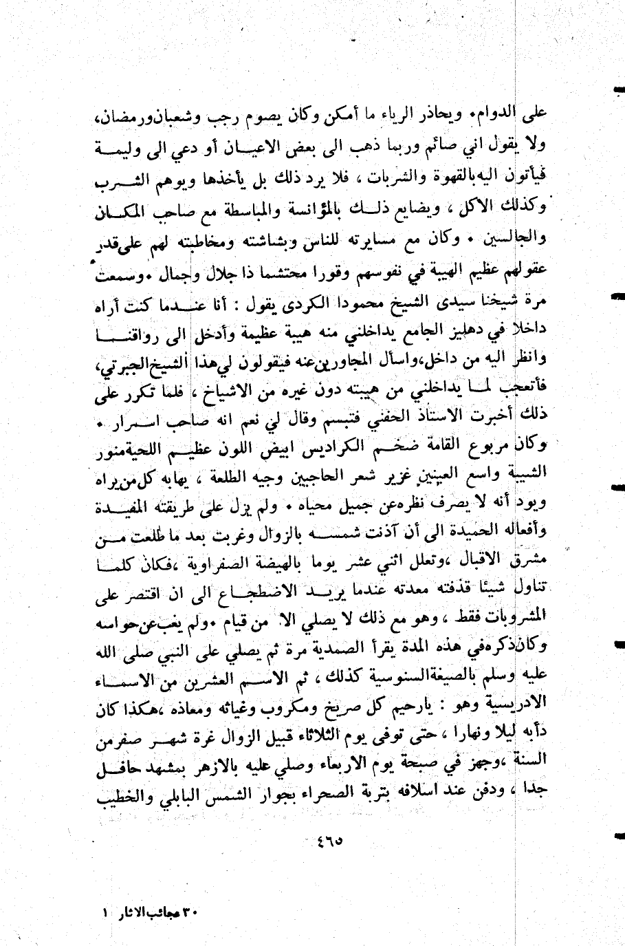 على الدوام. ويحاذر الرياء ما أمكن وكان يصوم رجب وشعبان ورمضان ولا يقول: إني صائم وربما ذهب إلى بعض الأعيان أو دعي إلى وليمة فيأتون إليه بالقهوة والشربات فلا يرد ذلك بل يأخذها ويوهم الشرب وكذلك الأكل ويضايع ذلك بالمؤانسة والمباسطة مع صاحب المكان والجالسين. وكان مع مسايرته للناس وبشاشته ومخاطبته لهم على قدر عقولهم عظيم الهيبة في نفوسهم وقورا محتشما ذا جلال وجمال. وسمعت مرة شيخنا سيدي الشيخ محمودا الكردى يقول: أنا عندما كنت أراه داخلا في دهليز الجامع يداخلني منه هيبة عظيمة وأدخل إلى رواقنا وانظر إليه من داخل وأسأل المجاورين عنه فيقولون لي هذا الشيخ الجبرتي فأتعجب لما يداخلني من هيبته دون غيره من الأشياخ فلما تكرر على ذلك أخبرت الأستاذ الحفني فتبسم وقال لي: نعم أنه صاحب اسرار. وكان مربوع القامة ضخم الكراديس ابيض اللون عظيم اللحية منور الشيبة واسع العينين غزير شعر الحاجبين وجيه الطلعة يهابه كل من يراه ويود أنه لا يصرف نظره عن جميل محياه. ولم يزل على طريقته المفيدة وأفعاله الحميدة إلى أن آذنت شمسه بالزوال وغربت بعد ما طلعت من مشرق الاقبال وتعلل اثني عشر يوما بالهيضة الصفراوية فكان كلما تناول شيئا قذفته معدته عندما يريد الاضطجاع إلى أن اقتصر على المشروبات فقط وهو مع ذلك لا يصلي إلا من قيام. ولم يغب عن حواسه وكان ذكره في هذه المدة يقرأ الصمدية مرة ثم يصلي على النبي صلى الله عليه وسلم بالصيغة السنوسية كذلك ثم الأسم العشرين من الأسماء الإدريسية وهو يا رحيم كل صريخ ومكروب وغياثه ومعاذه هكذا كان دأبه ليلا ونهارا حتى توفى يوم الثلاثاء قبيل الزوال غرة شهر صفر من السنة وجهز في صبحة يوم الأربعاء وصلي عليه بالأزهر بمشهد حافل جدا ودفن عند اسلافه بتربة الصحراء بجوار الشمس البابلي والخطيب