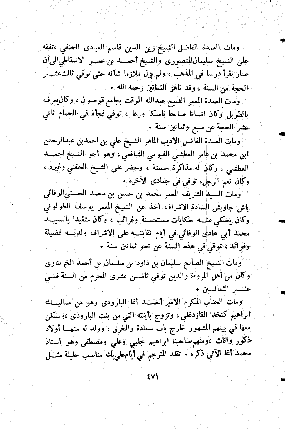 ومات الجناب المكرم الأمير أحمد أغا البارودي وهو من مماليك إبراهيم كتخدا القازدغلي وتزوج بأبنته التي من بنت البارودي وسكن معها في بيتهم المشهور خارج باب سعادة والخرق وولد له منها أولاد ذكور واناث ومنهم صاحبنا إبراهيم جلبي وعلي ومصطفى وهو أستاذ محمد أغا الآتي ذكره ذكره. تقلد المترجم في أيام علي بك مناصب جليلة مثل