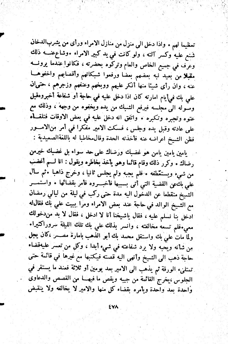 تعظيما لهم. وإذا دخل منزل من منازل الأمراء ورأى من يشرب الدخان شنع عليه وكسر آلته ولو كانت في يد كبير الأمراء. وشاع عنه ذلك وعرف في جميع الخاص والعام وتركوه بحضرته فكانوا عندما يرونه مقبلا منن بعيد نبه بعضهم بعضا ورفعوا شبكاتهم وأقصابهم واخفوها عنه ولإن رأى شيئا منها أنكر عليهم ووبخهم وعنفهم وزجرهم حتى أن علي بك في أيام لإمارته كان إذا دخل عليه في حاجة أو شفاعة أخبروه قبل وصوله إلى مجلسه فيرفع الشبك من يده ويخفوه من وجهه وذلك مع عتوه وتجبره وتكبره. واتفق أنه دخل عليه في بعض الأوقات فتلقاه على عادته وقبل يده وجلس فسكت الأمير مفكرا في أمر من الأمور فظن الشيخ اعراضه عنه فأخذته الحدة وقال مخاطبا له باللغة الصعيدية.