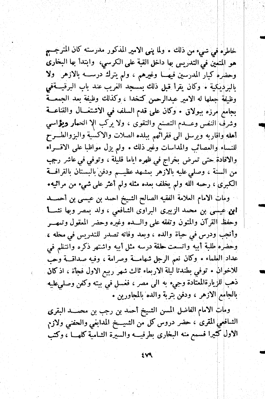 خاطره في شيء من ذلك. ولما بنى الأمير المذكور مدرسته كان المترجم هو المتعين في التدريس بها داخل القبة على الكرسي وابتدأ بها البخارى وحضره كبار المدرسين فيها وغيرهم ولم يترك درسه بالأزهر ولا بالبرديكية. وكان يقرأ قبل ذلك بمسجد الغريب عند باب البرقية في وظيفة جعلها له الأمير عبد الرحمن كتخدا وكذلك وظيفة بعد الجمعة بجامع مرزه ببولاق. وكان على قدم السلف في الأشتغال والقناعة وشرف النفس وعدم التصنع والتقوى ولا يركب إلا الحمار ويؤاسي أهله وأقاربه ويرسل إلى فقرائهم ببلده الصلات والاكسية والبز والطرح للنساء والعصائب والمداسات وغير ذلك. ولم يزل مواظبا على الأقراء والإفادة حتى تمرض بخراج في ظهره أياما قليلة وتوفي في عاشر رجب من السنة وصلي عليه بالأزهر بمشهد عظيم ودفن بالبستان بالقرافة الكبرى رحمه الله ولم يخلف بعده مثله ولم أعثر على شيء من مراثيه. ومات الإمام العلامة الفقيه الصالح الشيخ أحمد بن عيسى بن أحمد ابن عيسى بن محمد الزبيرى البراوى الشافعي ولد بمصر وبها نشأ وحفظ القرآن والمتون وتفقه على والده وغيره وحضر المعقول وتمهر وأنجب ودرس في حياة والده وبعد وفاته تصدر للتدريس في محله وحضره طلبة أبيه واتسعت حلقة درسه مثل أبيه واشتهر ذكره وانتظم في عداد العلماء. وكان نعم الرجل شهامة وصرامة وفيه صداقة وحب للإخوان. توفي بطندتا ليلة الأربعاء ثالث شهر ربيع الأول فجأة إذ كان ذهب للزيارة المعتادة وجيء به إلى مصر فغسل في بيته وكفن وصلي عليه بالجامع الأزهر ودفن بتربة والده بالمجاورين.