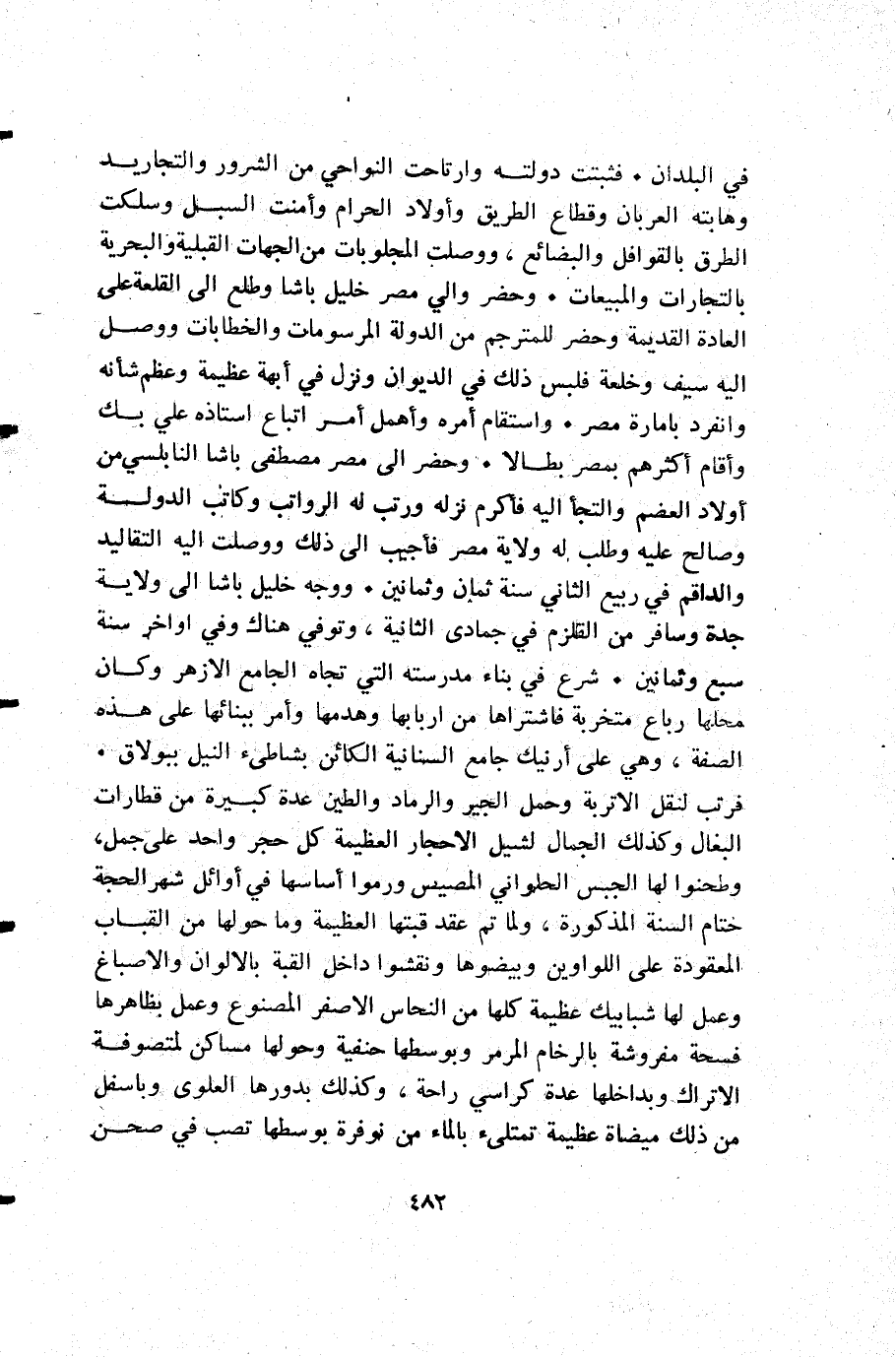 في البلدان. فثبتت دولته وارتاحت النواحي من الشرور والتجاريد وهابته العربان وقطاع الطريق وأولاد الحرام وأمنت السبل وسلكت الطرق بالقوافل والبضائع ووصلت المجلوبات من الجهات القبلية والبحرية بالتجارات والمبيعات. وحضر والي مصر خليل باشا وطلع إلى القلعة على العادة القديمة وحضر للمترجم من الدولة المرسومات والخطابات ووصل إليه سيف وخلعة فلبس ذلك في الديوان في أبهة عظيمة وعظم شأنه وانفرد بامارة مصر. واستقام أمره وأهمل أمر اتباع أستاذه علي بك وأقام أكثرهم بمصر بطالا. وحضر إلى مصر مصطفى باشا النابلسي من أولاد العضم والتجأ إليه فأكرم نزله ورتب له الرواتب وكاتب الدولة وصالح عليه وطلب له ولاية مصر فأجيب إلى ذلك ووصلت إليه التقاليد والداقم في ربيع الثاني سنة ثمان وثمانين. ووجه خليل باشا إلى ولاية جدة وسافر من القلزم في جمادى الثانية وتوفي هناك وفي أواخر سنة سبع وثمانين. شرع في بناء مدرسته التي تجاه الجامع الأزهر وكان محلها رباع متخربة فاشتراها من أربابها وهدمها وأمر ببنائها على هذه الصفة وهي على أرنيك جامع السنانية الكائن بشاطىء النيل ببولاق. فرتب لنقل الاتربة وحمل الجير والرماد والطين عدة كبيرة من قطارات البغال وكذلك الجمال لشيل الاحجار العظيمة كل حجر واحد على جمل وطحنوا لها الجبس الحلواني المصيص ورموا أساسها في أوائل شهر الحجة ختام السنة المذكورة ولما تم عقد قبتها العظيمة وما حولها من القباب المعقودة على اللواوين وبيضوها ونقشوا داخل القبة بالألوان والاصباغ وعمل لها شبابيك عظيمة كلها من النحاس الأصفر المصنوع وعمل بظاهرها فسحة مفروشة بالرخام المرمر وبوسطها حنفية وحولها مساكن لمتصوفة الأتراك وبداخلها عدة كراسي راحة وكذلك بدورها العلوى وباسفل من ذلك ميضاة عظيمة تمتلىء بالماء من نوفرة بوسطها تصب في صحن