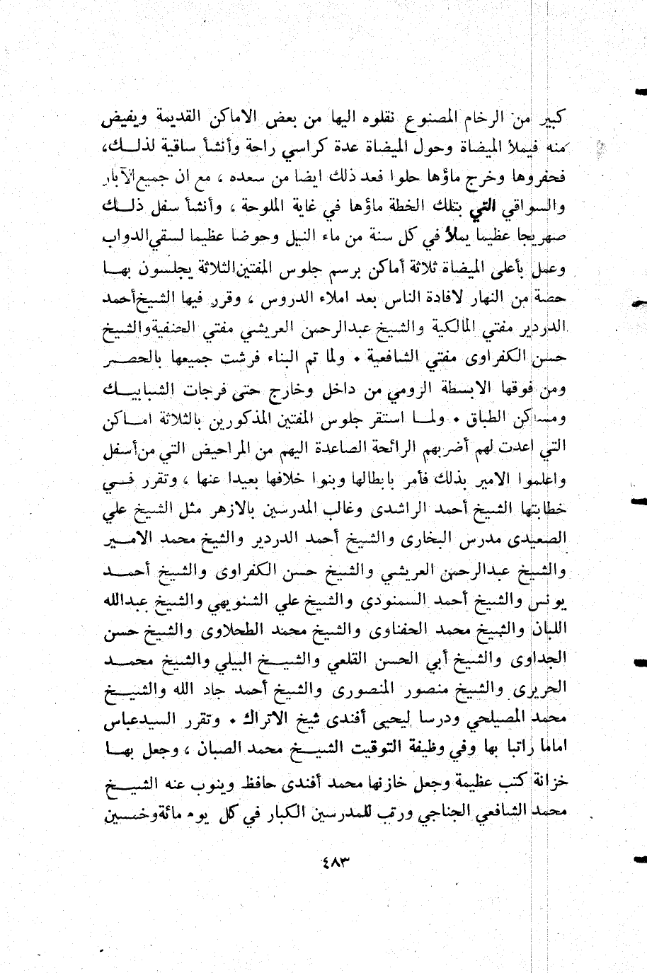كبير من الرخام المصنوع نقلوه إليها من بعض الاماكن القديمة ويفيض منه فيملأ الميضاة وحول الميضاة عدة كراسي راحة وأنشأ ساقية لذلك فحفروها وخرج ماؤها حلوا فعد ذلك أيضا من سعده مع أن جميع الآبار والسواقي التي بتلك الخطة ماؤها في غاية الملوحة وأنشأ سفل ذلك صهريجا عظيما يملأ في كل سنة من ماء النيل وحوضا عظيما لسقي الدواب وعمل بأعلى الميضاة ثلاثة أماكن برسم جلوس المفتين الثلاثة يجلسون بها حصة من النهار لإفادة الناس بعد املاء الدروس وقرر فيها الشيخ أحمد الدردير مفتي المالكية والشيخ عبد الرحمن العريشي مفتي الحنفية والشيخ حسن الكفراوي مفتي الشافعية. ولما تم البناء فرشت جميعها بالحصر ومن فوقها الأبسطة الرومي من داخل وخارج حتى فرجات الشبابيك ومساكن الطباق. ولما استقر جلوس المفتين المذكورين بالثلاثة أماكن التي اعدت لهم أضربهم الرائحة الصاعدة إليهم من المراحيض التي من أسفل واعلموا الأمير بذلك فأمر بابطالها وبنوا خلافها بعيدا عنها وتقرر في خطابتها الشيخ أحمد الراشدى وغالب المدرسين بالأزهر مثل الشيخ علي الصعيدي مدرس البخارى والشيخ أحمد الدردير والشيخ محمد الأمير والشيخ عبد الرحمن العريشي والشيخ حسن الكفراوى والشيخ أحمد يونس والشيخ أحمد السمنودى والشيخ علي الشنويهي والشيخ عبد الله اللبان والشيخ محمد الحفناوى والشيخ محمد الطحلاوى والشيخ حسن الجداوى والشيخ أبي الحسن القلعي والشيخ البيلي والشيخ محمد الحريرى والشيخ منصور المنصورى والشيخ أحمد جاد الله والشيخ محمد المصيلحي ودرسا ليحيى أفندي شيخ الاتراك. وتقرر السيد عباس إماما راتبا بها وفي وظيفة التوقيت الشيخ محمد الصبان وجعل بهاى خزانة كتب محمد أفندى حافظ وينوب عنه الشيخ محمد الشافعي الجناحي ورتب للمدرسين الكبار في كل يوم مائة وخمسين