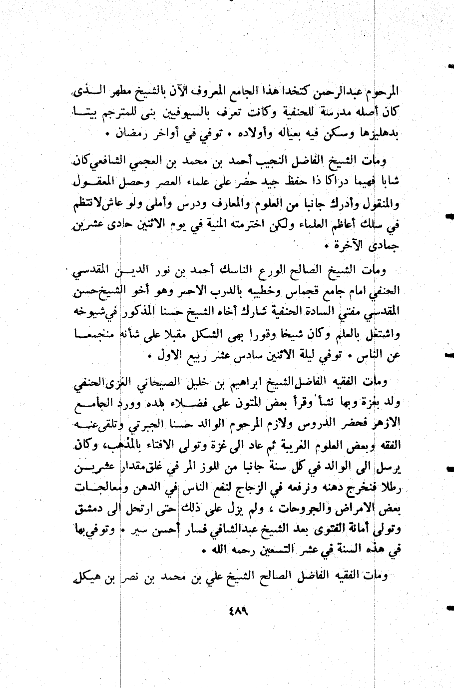 ومات الفقيه الفاضل الشيخ إبراهيم بن خليل الصيحاني الغزى الحنفي ولد بغزة وبها نشأ وقرأ بعض المتون على فضلاء بلده وورد الجامع الأزهر فحضر الدروس ولازم المرحوم الوالد حسنا الجبرتي وتلقى عنه الفقه وبعض العلوم الغريبة ثم عاد إلى غزة وتولى الافتاء بالمذهب وكان يرسل إلى الوالد في كل سنة جانبا من الموز المر في غلق مقدار عشرين رطلا فنخرج دهنه ونرفعه في الزجاج لنفع الناس في الدهن ومعالجات بعض الأمراض والجروحات ولم يزل على ذلك حتى ارتحل إلى دمشق وتولى أمانة الفتوى بعد الشيخ عبد الشافعي فسار أحسن سير. وتوفي بها في هذه السنة في عشر التسعين رحمه الله.