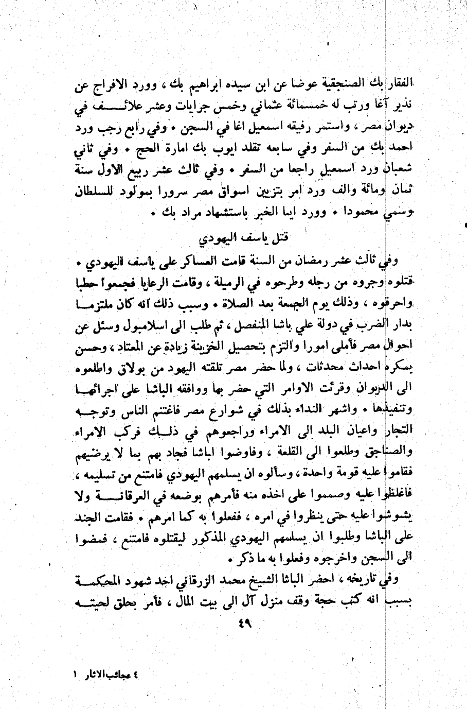 وفي ثالث عشر رمضان من السنة قامت العساكر على ياسف اليهودي. قتلوه وجروه من رجله وطرحوه في الرميلة وقامت الرعايا فجمعوا حطبا واحرقوه وذلك يوم الجمعة بعد الصلاة. وسبب ذلك أنه كان ملتزما بدار الضرب في دولة علي باشا المنفصل ثم طلب إلى اسلامبول وسئل عن احوال مصر فأملى أمورا والتزم بتحصيل الخزينة زيادة عن المعتاد وحسن بمكره أحداث محدثات ولما حضر مصر تلقته اليهود من بولاق واطلعوه إلى الديوان وقرئت الأوامر التي حضر بها ووافقه الباشا على إجرائها وتنفيذها. واشهر النداء بذلك في شوارع مصر فاغتنم الناس وتوجه التجار وأعيان البلد إلى الأمراء وراجعوهم في ذلك فركب الأمراء والصناجق وطلعوا إلى القلعة وفاوضوا الباشا فجاد بهم بما لا يرضيهم فقاموا عليه قومة واحدة وسألوه أن يسلمهم اليهودي فامتنع من تسليمه فاغلظوا عليه وصمموا على اخذه منه فأمرهم بوضعه في العرقانة ولا يشوشوا عليه حتى ينظروا في امره ففعلوا به كما أمرهم. فقامت الجند على الباشا وطلبوا أن يسلمهم اليهودي المذكور ليقتلوه فامتنع فمضوا إلى السجن واخرجوه وفعلوا به ما ذكر.