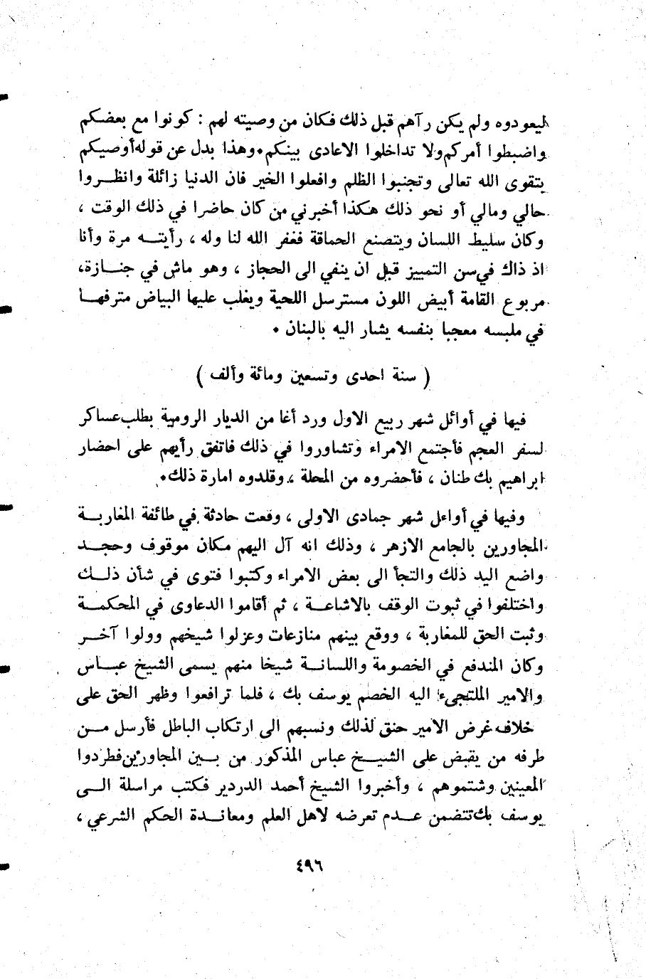 وفيها في أوائل شهر جمادى الأولى وقعت حادثة في طائفة المغاربة المجاورين بالجامع الأزهر وذلك أنه آل إليهم مكان موقوف وحجد واضع اليد ذلك والتجأ إلى بعض الأمراء وكتبوا فتوى في شأن ذلك واختلفوا في ثبوت الوقف بالاشاعة ثم أقاموا الدعاوى في المحكمة وثبت الحق للمغاربة ووقع بينهم منازعات وعزلوا شيخهم وولوا آخر وكان المندفع في الخصومة واللسانة شيخا منهم يسمى الشيخ عباس والأمير الملتجىء إليه الخصم يوسف بك فلما ترافعوا وظهر الحق على خلاف غرض الأمير حنق لذلك ونسبهم إلى ارتكاب الباطل فأرسل من طرفه من يقبض على الشيخ عباس المذكور من بين المجاورين فطردوا المعينين وشتموهم وأخبروا الشيخ أحمد الدردير فكتب مراسلة إلى يوسف بك تتضمن عدم تعرضه لأهل العلم ومعاندة الحكم الشرعي.