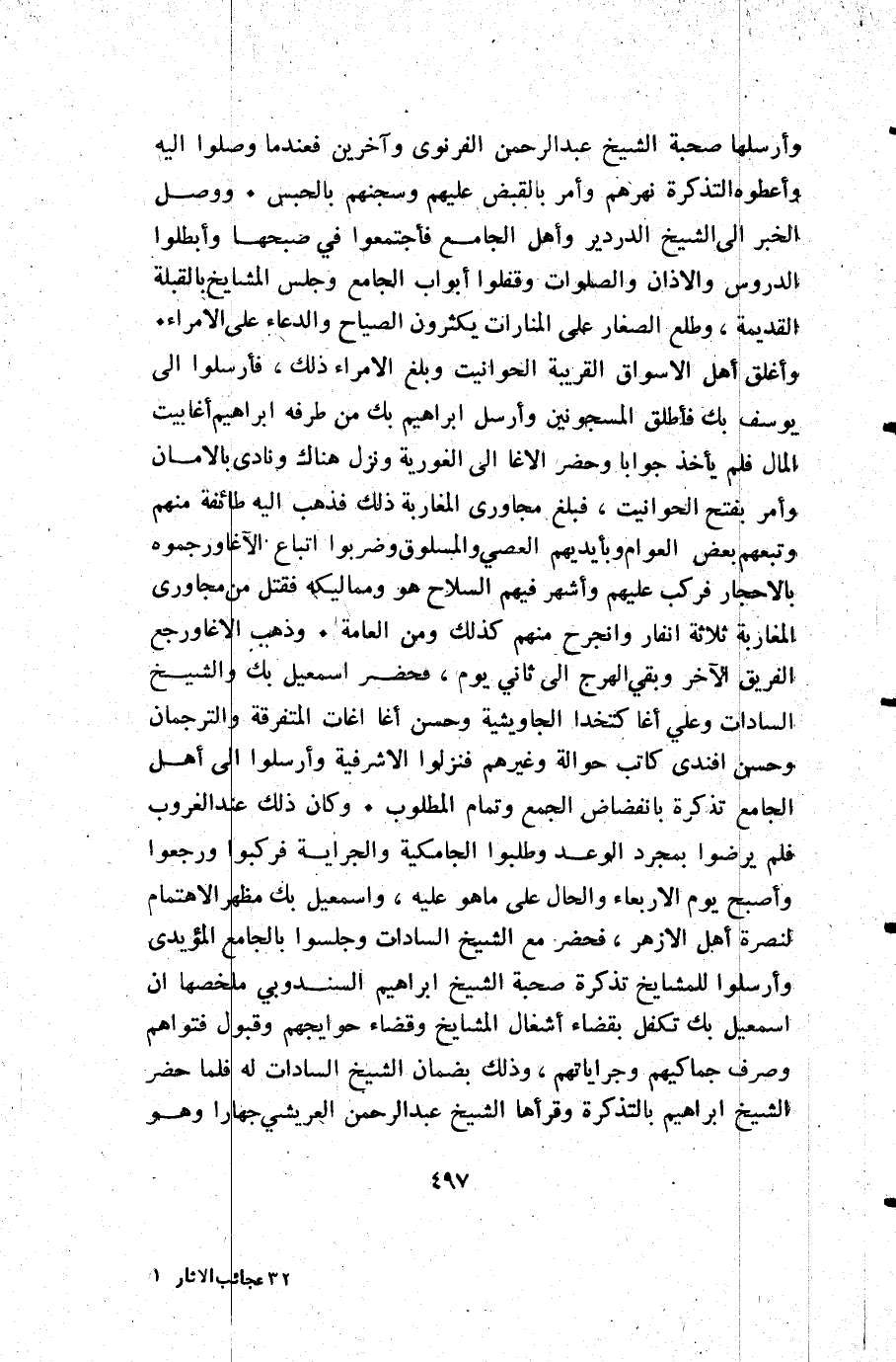 وأرسلها صحبة الشيخ عبد الرحمن الفرنوى وآخرين فعندما وصلوا إليه وأعطوه التذكرة نهرهم وأمر بالقبض عليهم وسجنهم بالحبس. ووصل الخبر إلى الشيخ الدردير وأهل الجامع فأجتمعوا في صبحها وأبطلوا الدروس وال إذان والصلوات وقفلوا أبواب الجامع وجلس المشايخ بالقبلة القديمة وطلع الصغار على المنارات يكثرون الصياح والدعاء على الأمراء. وأغلق أهل الأسواق القريبة الحوانيت وبلغ الأمراء ذلك فأرسلوا إلى يوسف بك فأطلق المسجونين وأرسل إبراهيم بك من طرفه إبراهيم أغابيت المال فلم يأخذ جوابا وحضر الأغا إلى الغورية ونزل هناك ونادى بالامان وأمر بفتح الحوانيت فبلغ مجاورى المغاربة ذلك فذهب إليه طائفة منهم وتبعهم بعض العوام وبأيديهم العصي والمسلوق وضربوا اتباع الأغا ورجموه بالأحجار فركب عليهم وأشهر فيهم السلاح هو ومماليكه فقتل من مجاورى المغاربة ثلاثة انفار وانجرح منهم كذلك ومن العامة. وذهب الأنما ورجع الفريق الآخر وبقي المهرج إلى ثاني يوم فحضر إسمعيل بك والشيخ السادات وعلي أغا كتخدا الجاويشية وحسن أغا اغات المتفرقة والترجمان وحسن أفندي كاتب حوالة وغيرهم فنزلوا الأشرفية وأرسلوا إلى أهل الجامع تذكرة بانفضاض الجمع وتمام المطلوب. وكان ذلك عند الغروب فلم يرضوا بمجرد الوعد وطلبوا الجامكية والجراية فركبوا ورجعوا وأصبح يوم الأربعاء والحال على ما هو عليه وإسمعيل بك مظهر الإهتمام لنصرة أهل الأزهر فحضر مع الشيخ السادات وجلسوا بالجامع المؤيدى وأرسلوا للمشايخ تذكرة صحبة الشيخ إبراهيم السندوبي ملخصها أن إسمعيل بك تكفل بقضاء أشغال المشايخ وقضاء حوايجهم وقبول فتواهم وصرف جماكيهم وجراياتهم وذلك بضمان الشيخ السادات له فلما حضر الشيخ إبراهيم بالتذكرة وقرأها الشيخ عبد الرحمن العريشي جهارا وهو