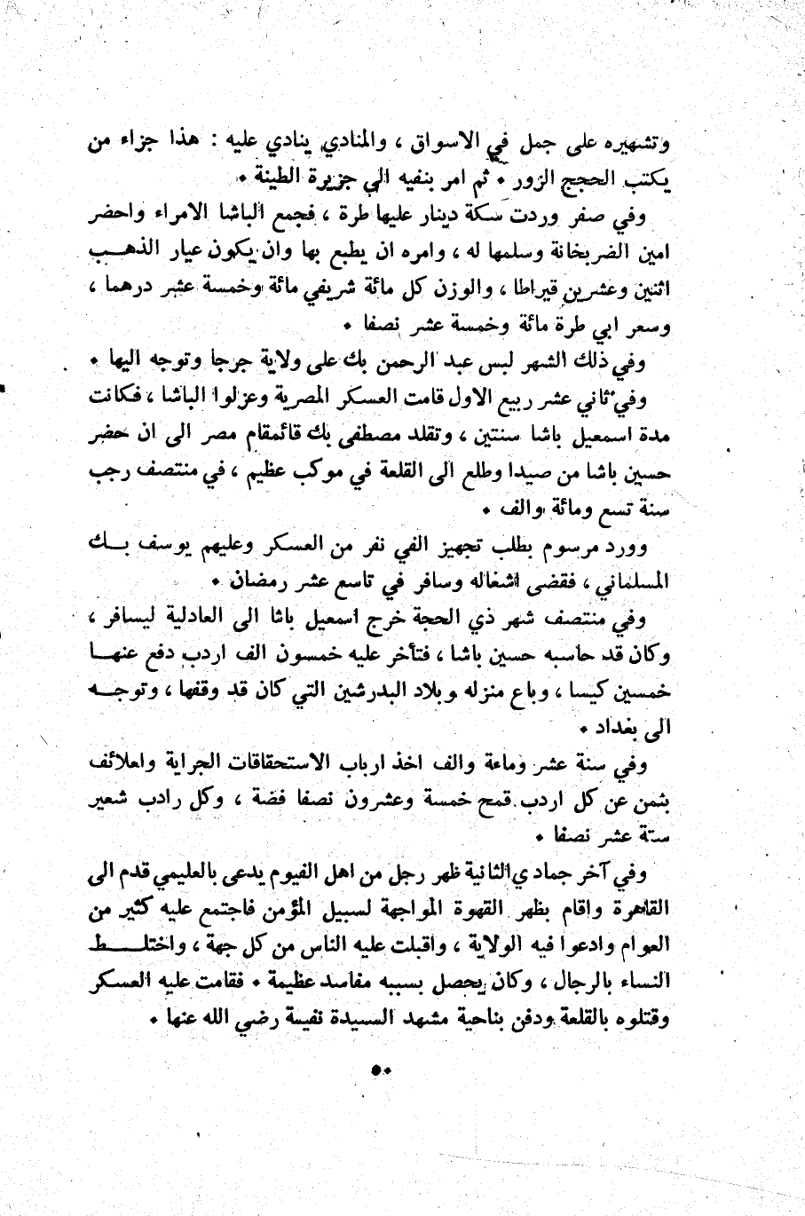 وفي ذلك الشهر لبس عبد الرحمن بك على ولاية جرجا وتوجه إليها. وفي ثاني عشر ربيع الأول قامت العسكر المصرية وعزلوا الباشا فكانت مدة إسمعيل باشا سنتين وتقلد مصطفى بك قائمقام مصر إلى أن حضر حسين باشا من صيدا وطلع إلى القلعة في موكب عظيم في منتصف رجب سنة تسع ومائة وألف.